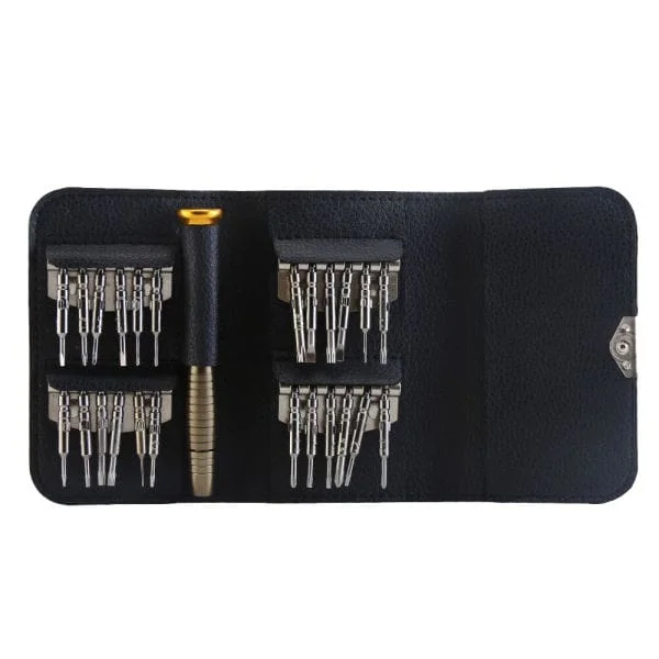 مجموعه 25 عددی پیچگوشتی برای مصارف تعمیرات عینک ، ساعت ، الکترونیک و … دارای کیف چرمی و خوش دست دارای دسته پیچگوشتی فلزی با دوام قابلیت اتصال سری های این ست به پیچ گوشتی برقی ظریف