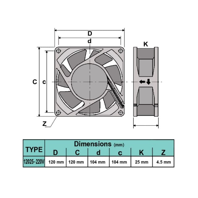 💎 مشخصات ظاهری فن بوشی 220 ولت مدل 12025 ابعاد 12x12x2.5