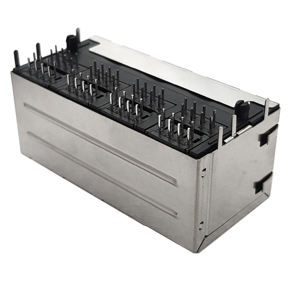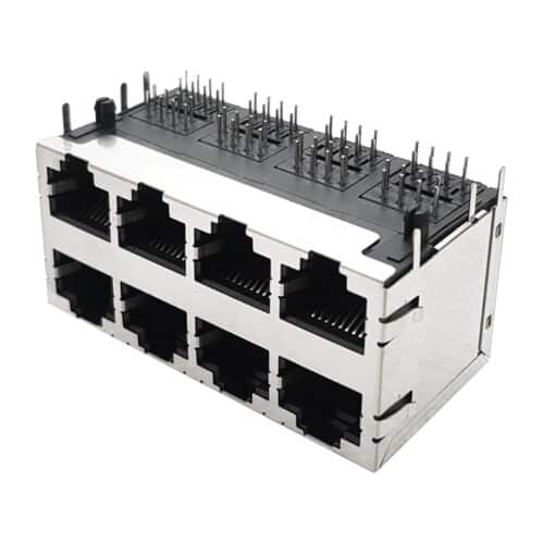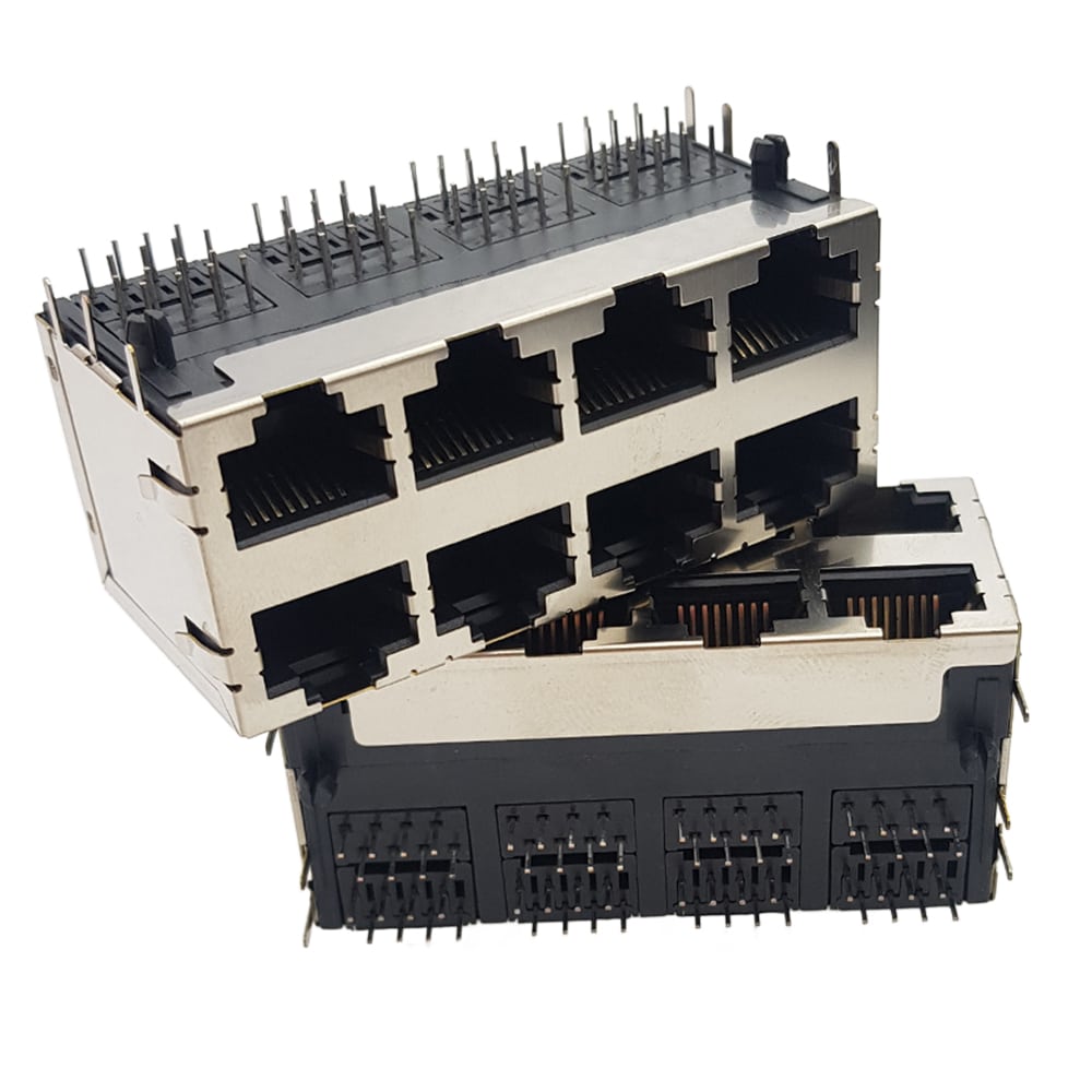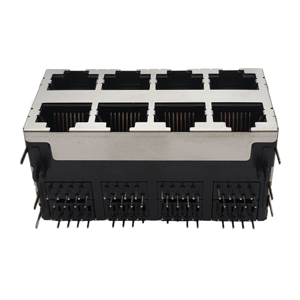 English name: 2×4 Stacked RJ45 (8P8C) Shielded Right‑Angle PCB‑Mount Modular Jack, Through‑Hole, suitable for Ethernet 10/100/1000Base‑T (with proper PHY & magnetics).