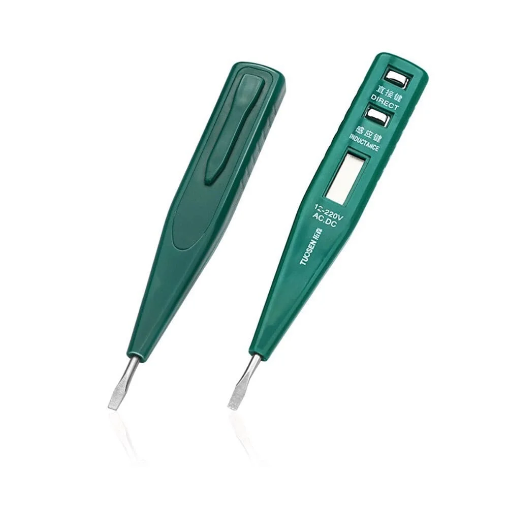 فازمتر دیجیتال توسن مدل TUOSEN 11314 با طراحی سبز رنگ و بدنه‌ای باریک و خوش‌دست ارائه می‌شود. بدنه پلاستیکی مقاوم در برابر ضربه، سبک و دارای گیره مخصوص برای قرارگیری در جیب است تا همیشه در دسترس شما باشد. صفحه نمایش دیجیتال وسط بدنه تعبیه شده تا اطلاعات ولتاژ را به وضوح نشان دهد. کلیدهای تست مستقیم و تست القایی (INDUCTANCE) کاربری آسان و حرفه‌ای را برای هر برقکاری ممکن می‌کند.