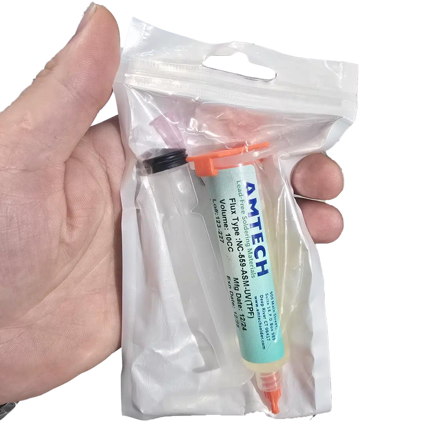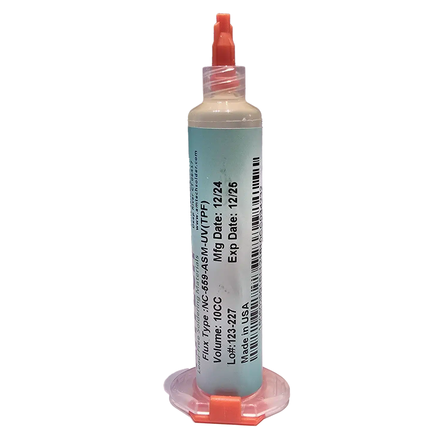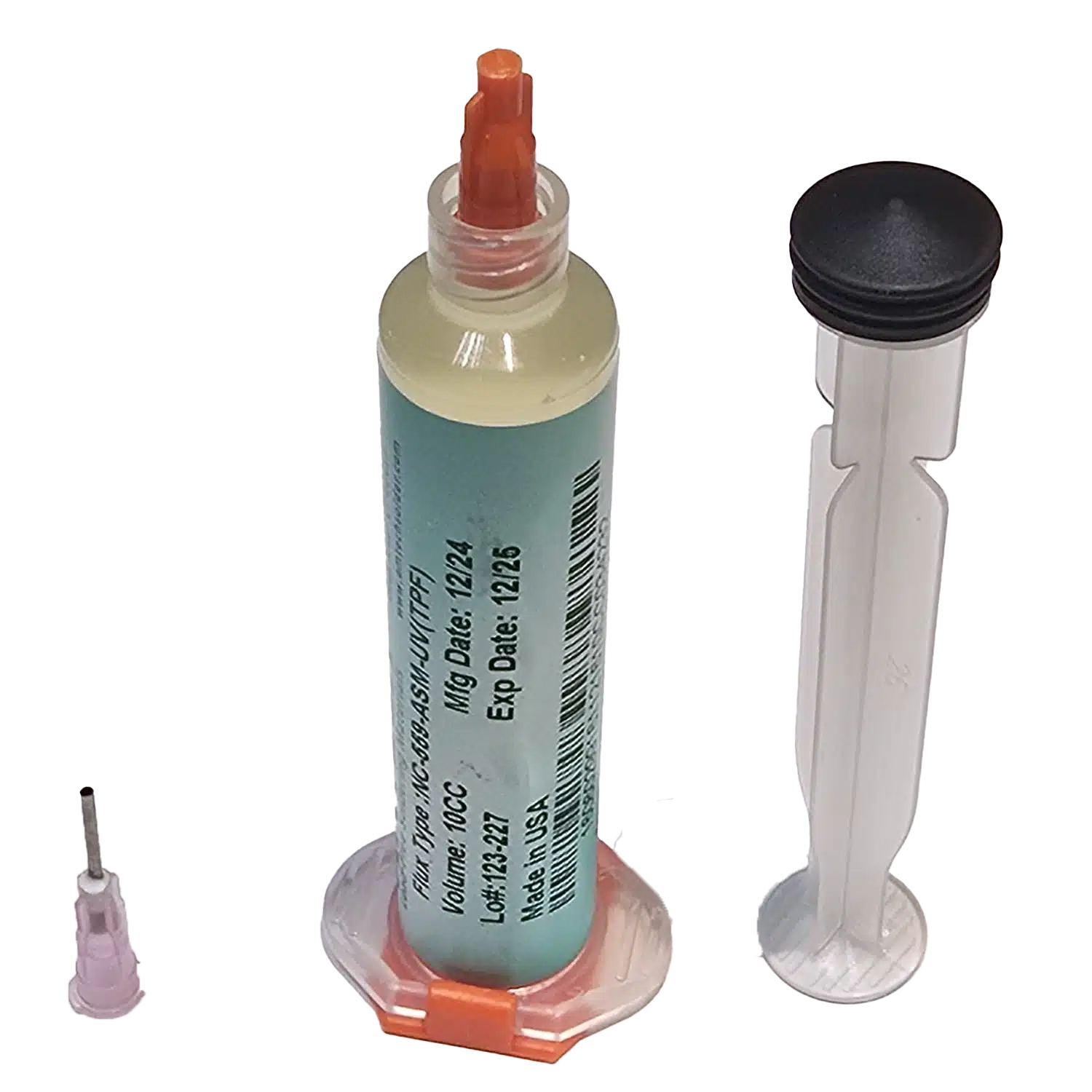 معادل انگلیسی: AMTECH Original Syringe Flux RMA‑223‑UV, 10cc, Lead‑Free, Full Pack (Plunger + Needle), LOT302, Mfg 11/2024 – Exp 11/2026.