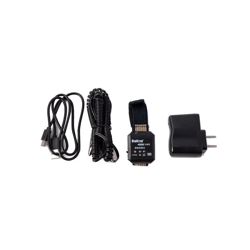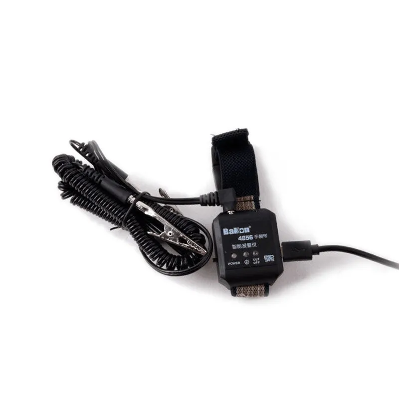 English name: Bakon BK-4856 Smart ESD Wrist Strap with Intelligent Alarm, dual-circuit monitoring, LED/Buzzer alert (BK-4856V with vibration), conductive silver-yarn band, coiled ground cord ~1.8 m, safety 1 MΩ resistor, USB-rechargeable alarm module.