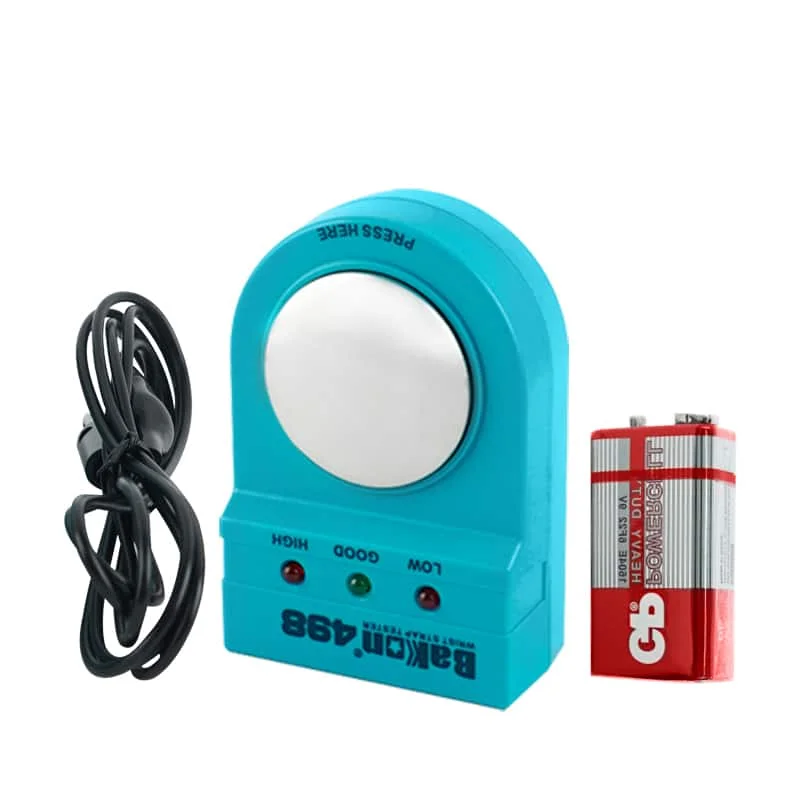 Bakon BK-498 ESD Wrist Strap Tester – 9V battery, resistance window 0.8–9 MΩ, compact 115×120×47 mm, LED status (LOW/GOOD/HIGH).