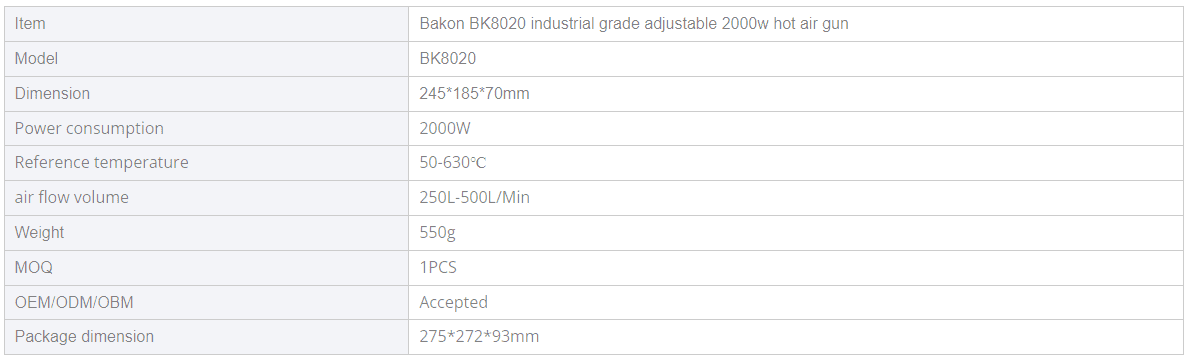 Bakon BK-8020 2000W Electronic Thermostat Hot Air Gun, temperature 50–630°C, LED display with memory, airflow 250/500 L/min.