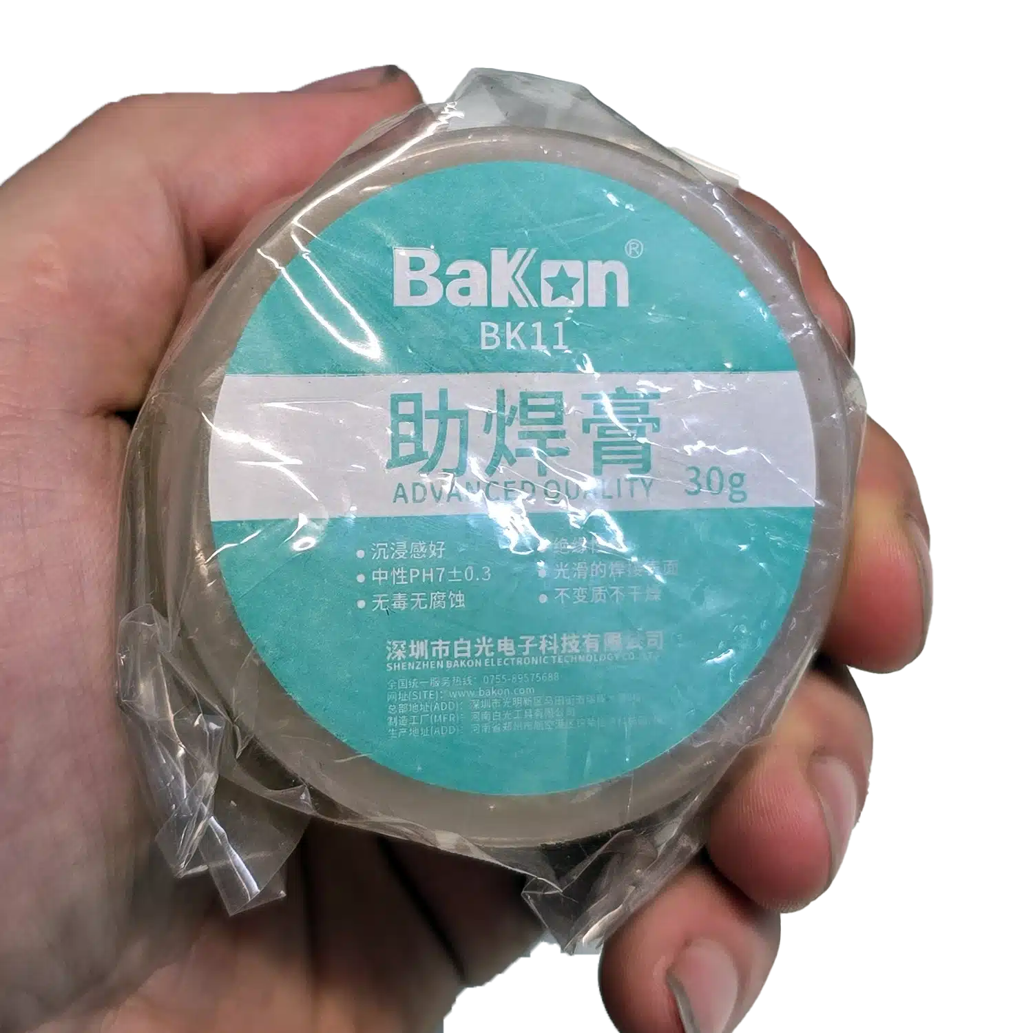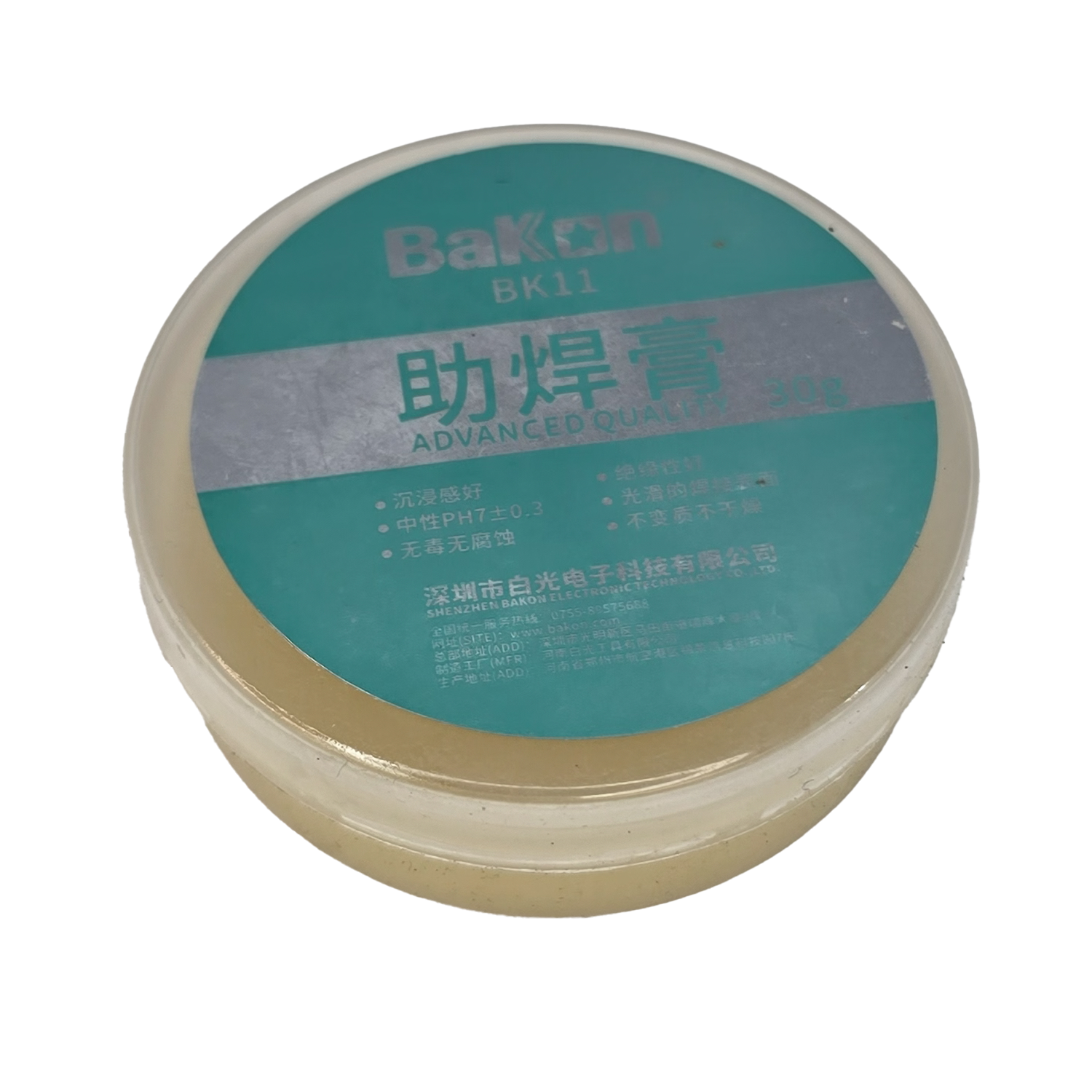 English: *Bakon BK11 Flux Paste, neutral pH 7±0.3, 30 g, non-corrosive, anti-oxidation, suitable for leaded & lead-free soldering.