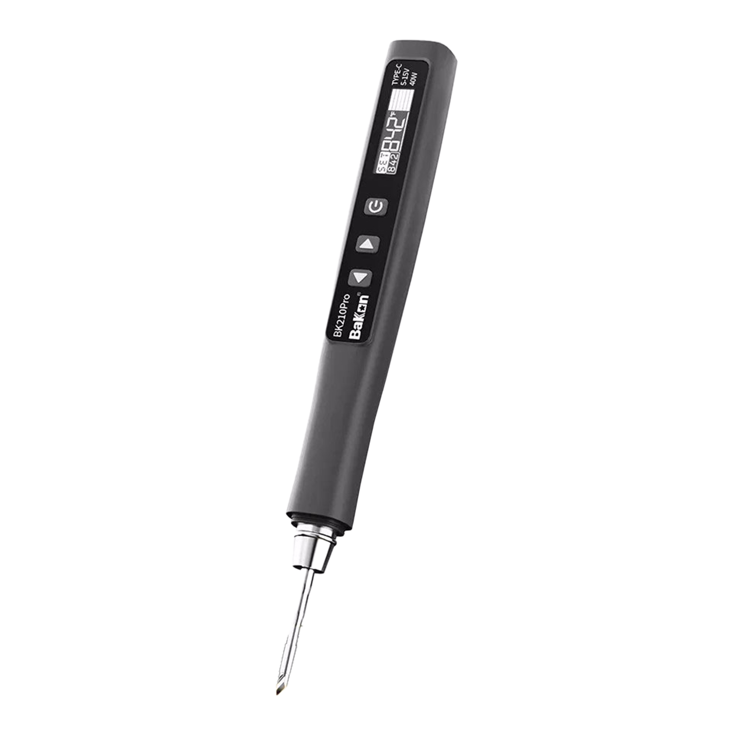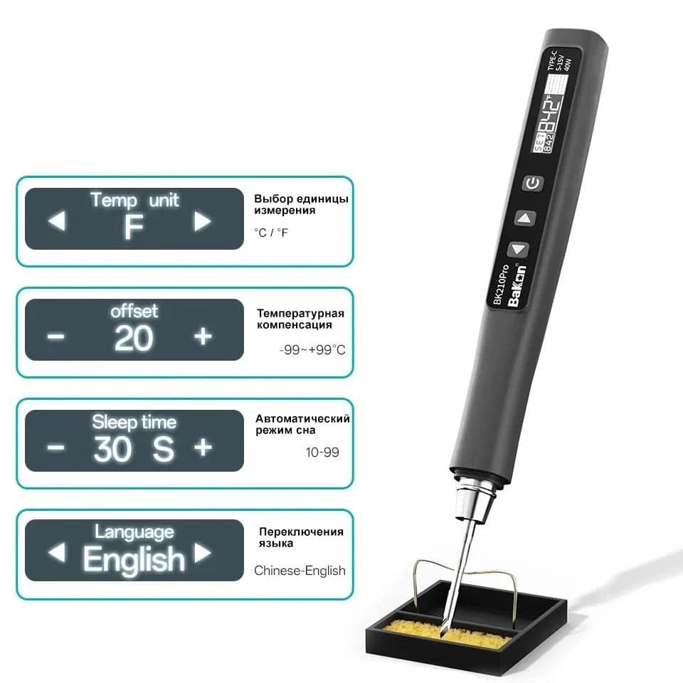 Bakon BK-210 Pro Portable Constant-Temperature Soldering Pen — 40W USB-C, JBC C210 tip series, OLED display, 100–420 °C with auto-sleep, temp offset و واحد دما °C/°F.