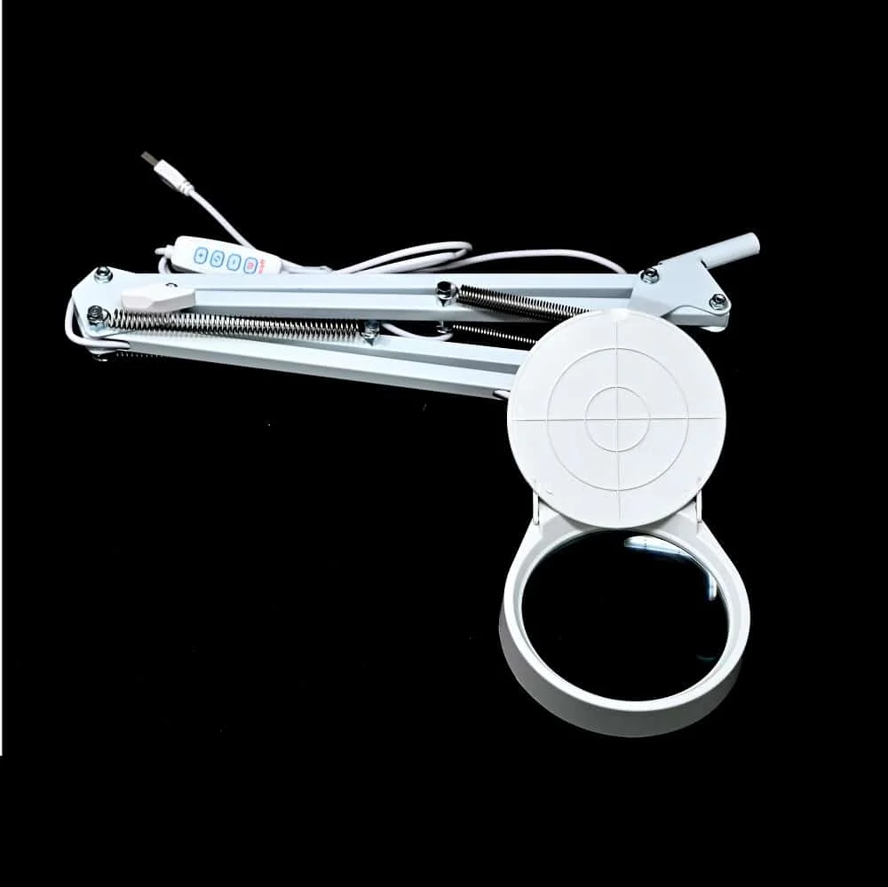 Bakon BKL4004 Clamp-On LED Magnifying Lamp — 10× magnification, Ø97 mm glass lens, 38-LED ring با دیمر روشنایی و سه دمای رنگ سفید (سرد/طبیعی/گرم ~5500–6500K)، بازوی فلزی فنردارِ گیره‌ای با طول مؤثر حدود 50 cm، تغذیه USB-5V یا AC 100–250V.