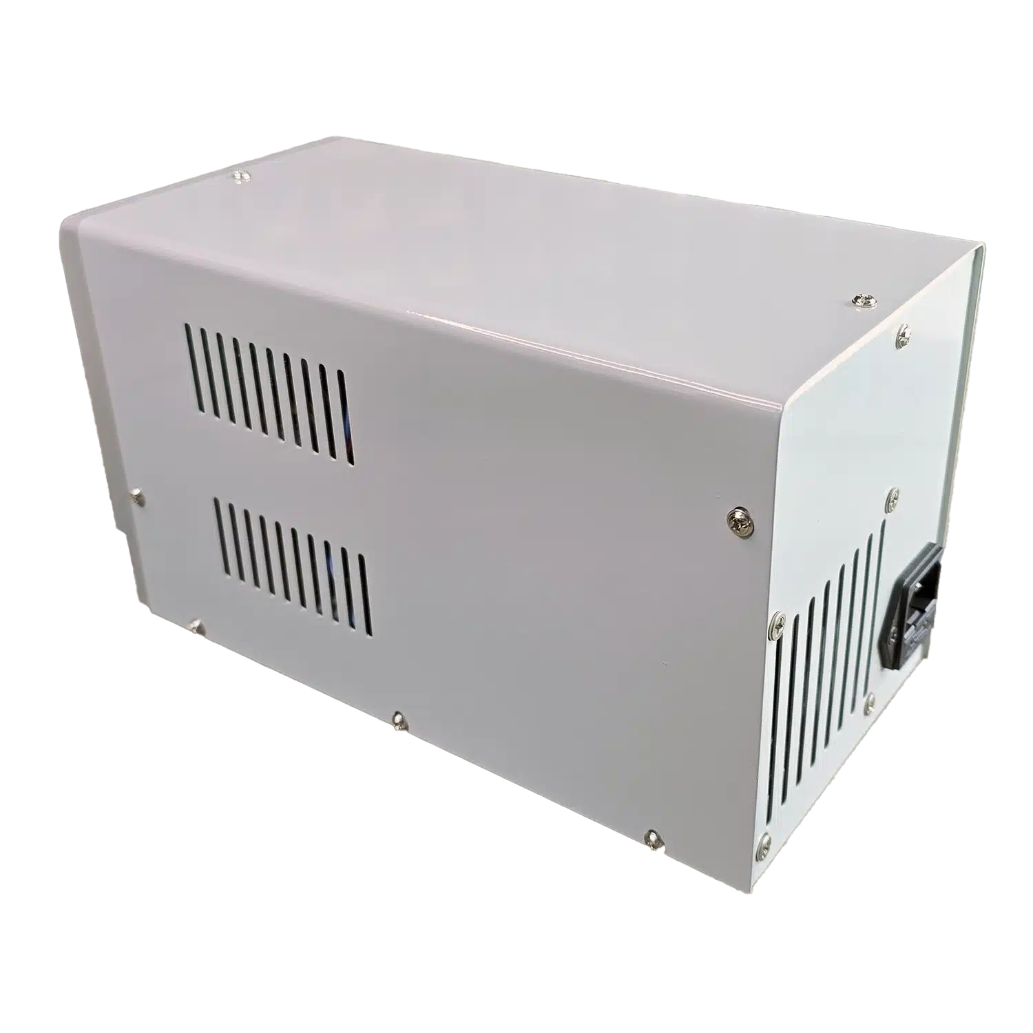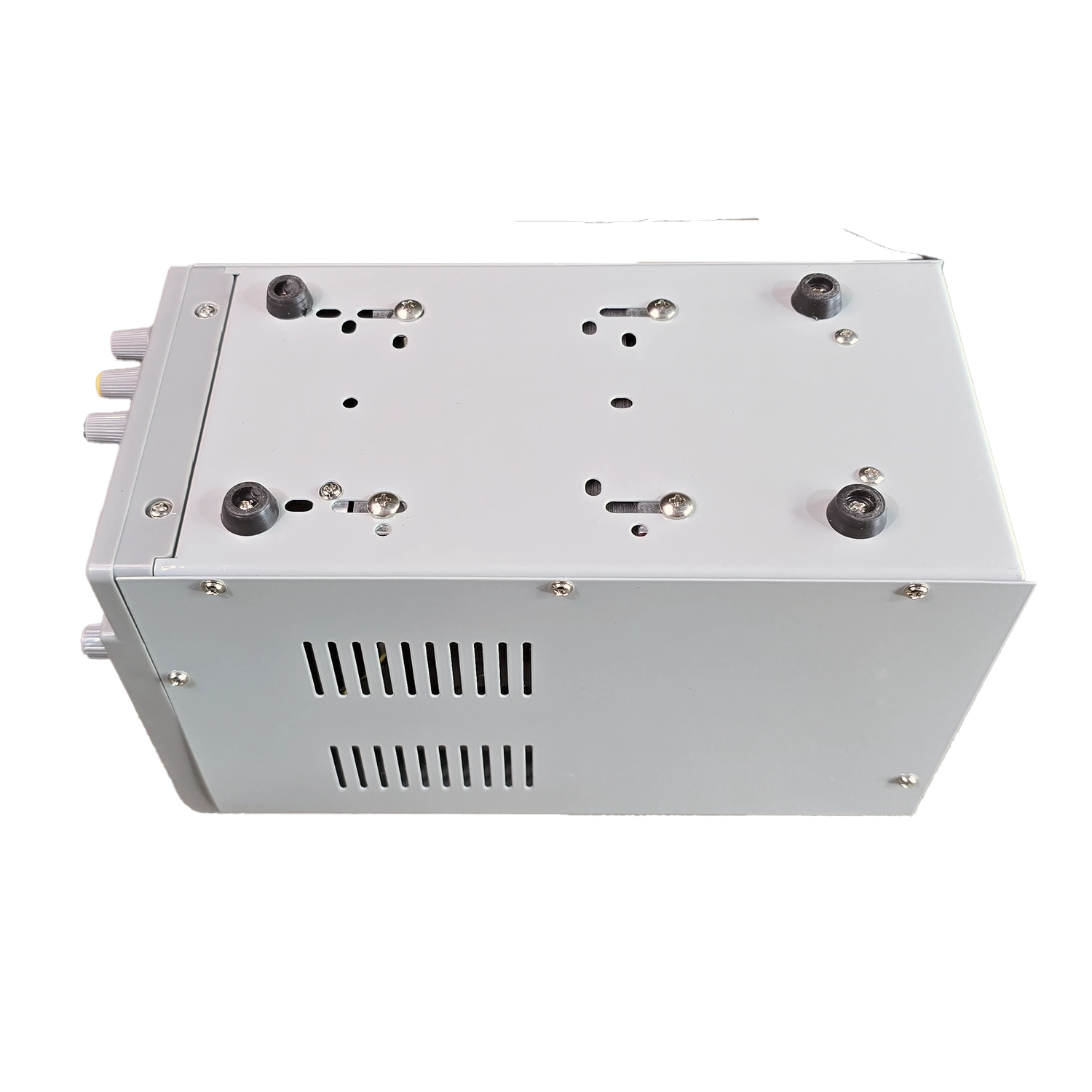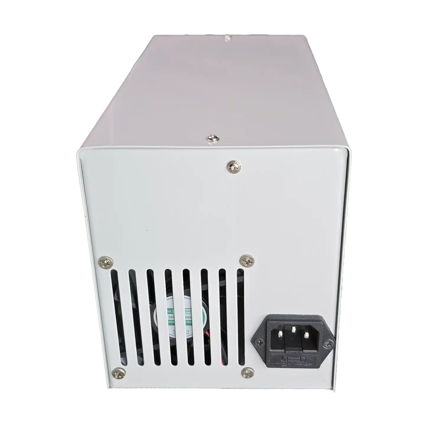 بدنه‌ی فلزی با رنگ پودری سفید صنعتی، دستگاه را در برابر خط‌وخش و ضربه‌های سبک محافظت می‌کند. شیارهای تهویه در دو طرف و پشت به همراه فن خنک‌کننده، دفع حرارت را تسهیل کرده و برای استفاده‌ی طولانی‌مدت پایدار است. پنل جلویی منظم با دو نمایشگر LED قرمز، چهار ولوم Fine/Coarse، نشانگرهای C.V/C.C و سه ترمینال خروجی کدگذاری‌شده، تجربه‌ای کاربرپسند و دقیق ارائه می‌دهد. وزن حدود ۴.۷ کیلوگرم نشانه‌ی ماهیت ترانسی و کیفیت قطعات داخلی است.