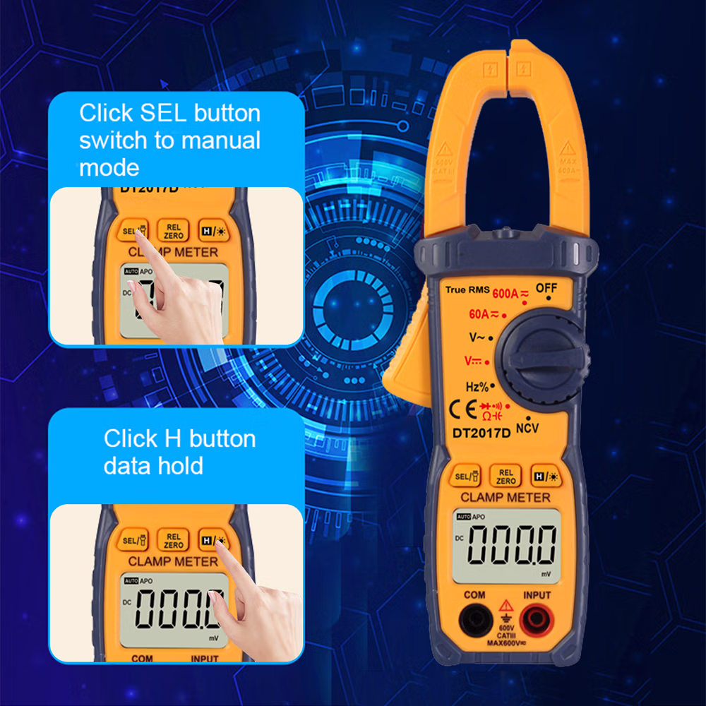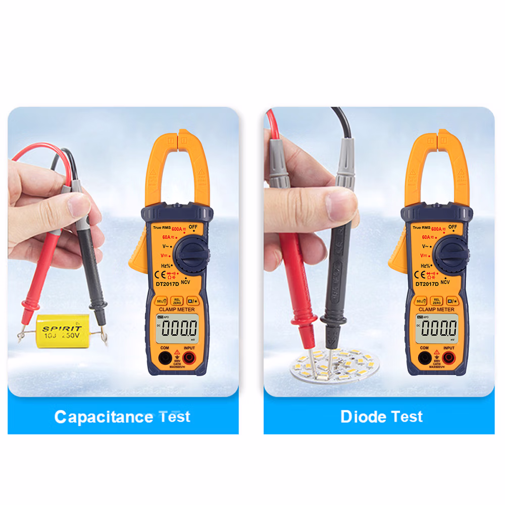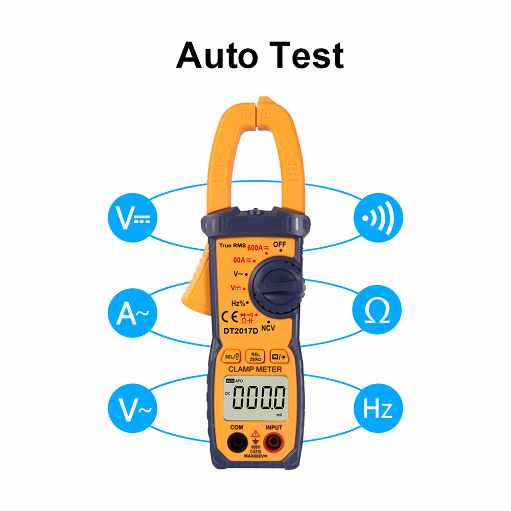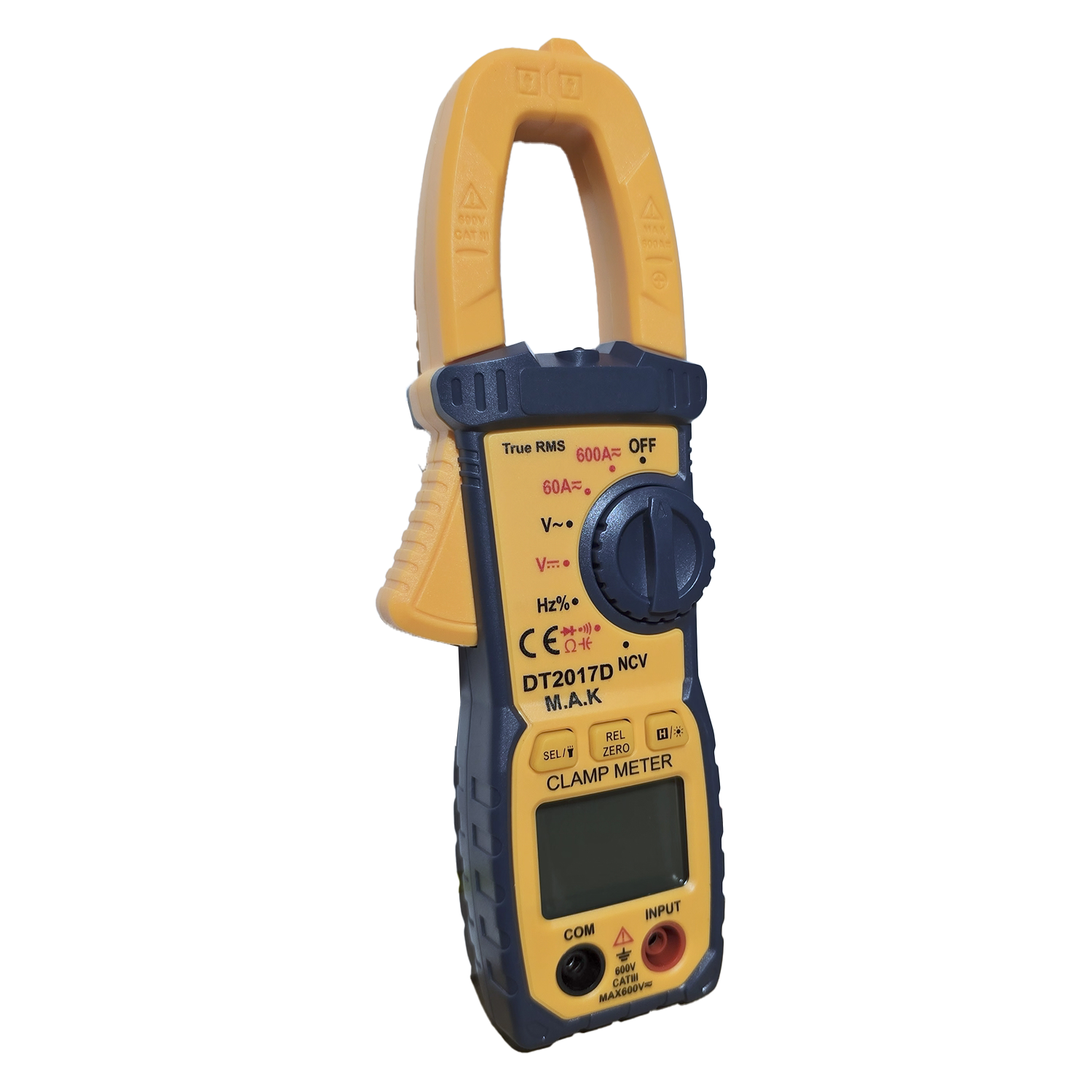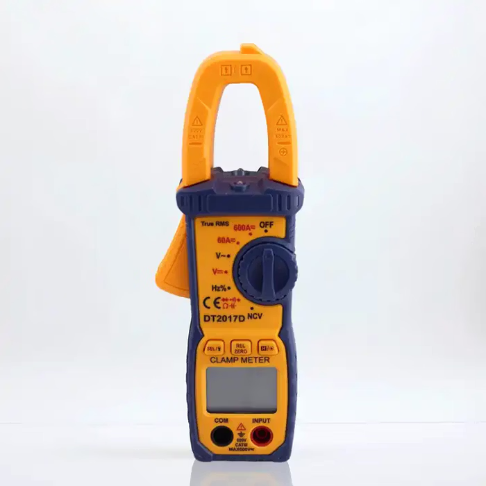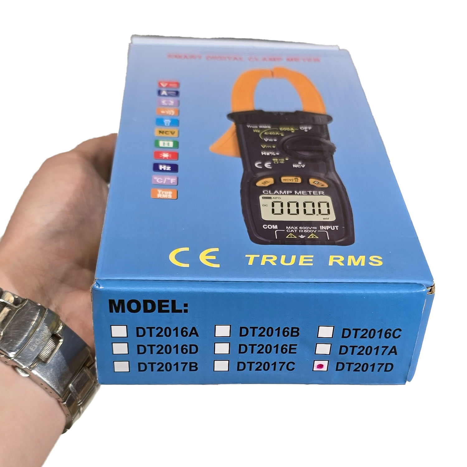 Digital Clamp Multimeter DT2017D — یک آمپرمتر انبری دیجیتال برای اندازه‌گیری جریان AC/DC تا 600 آمپر، ولتاژ AC/DC تا 600 ولت، مقاومت، تست بیزر/دیود و فرکانس با فک 28 میلی‌متری و بدنه‌ی جمع‌وجور (طول 203 میلی‌متر، عرض 68 میلی‌متر)؛ مناسب تکنسین‌های برق و تاسیسات، تعمیرکاران و کارگاه‌های صنعتی.