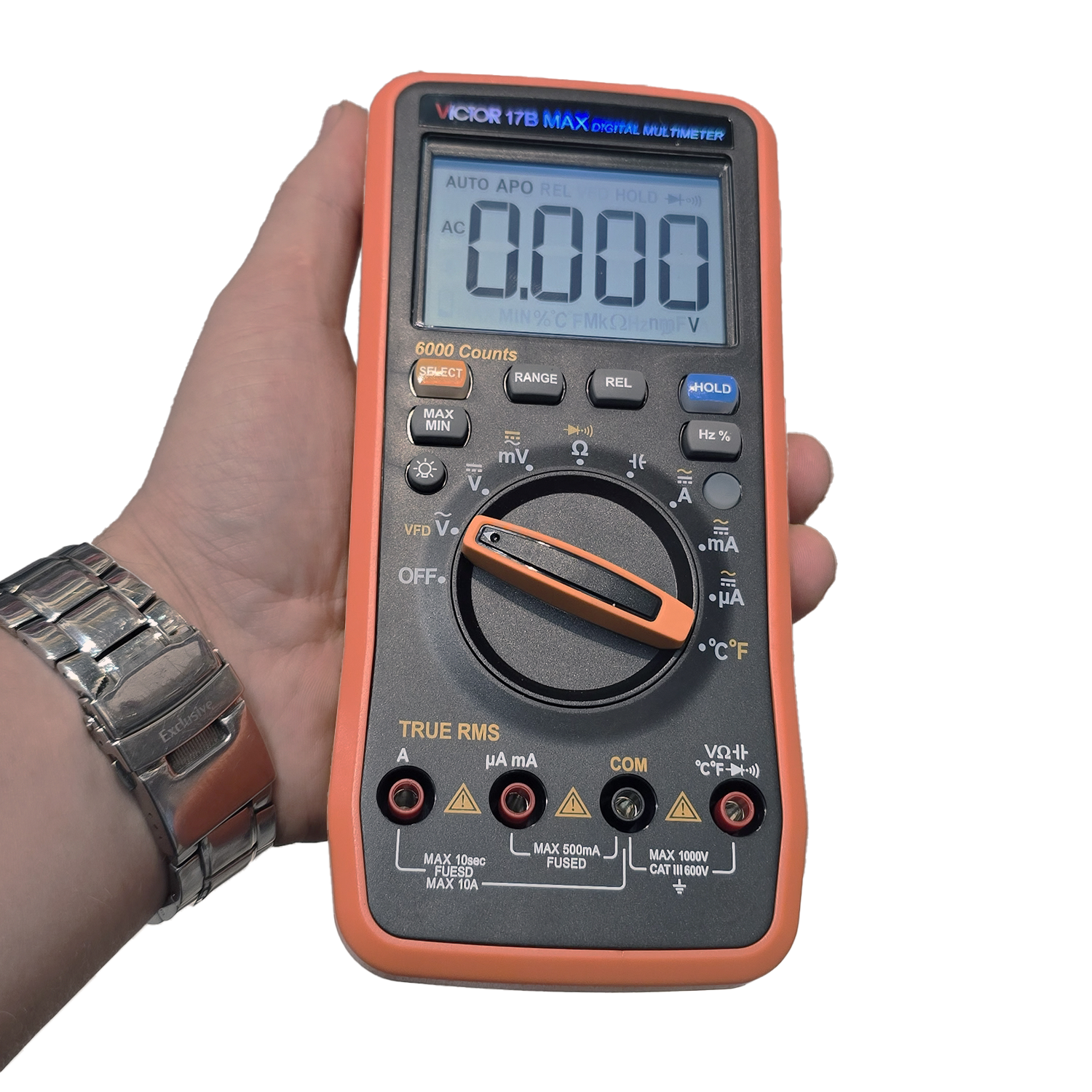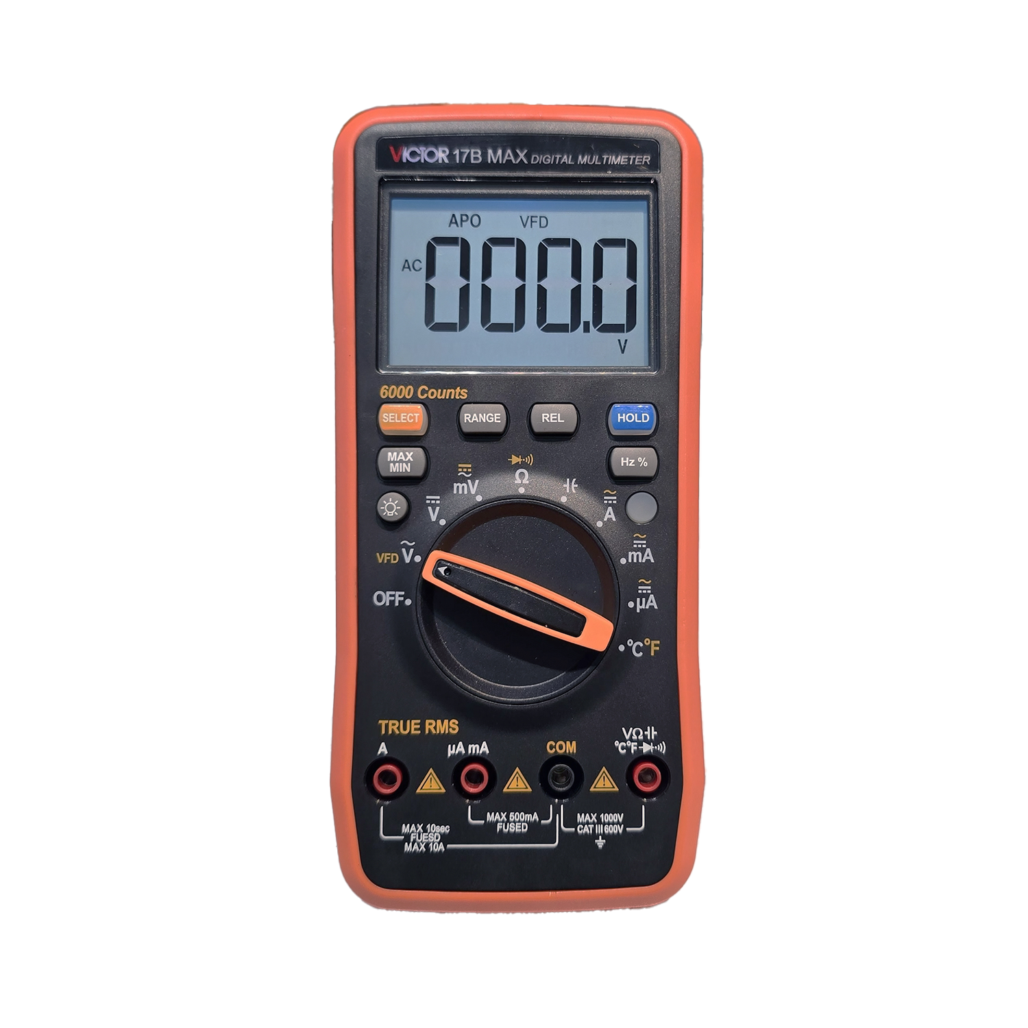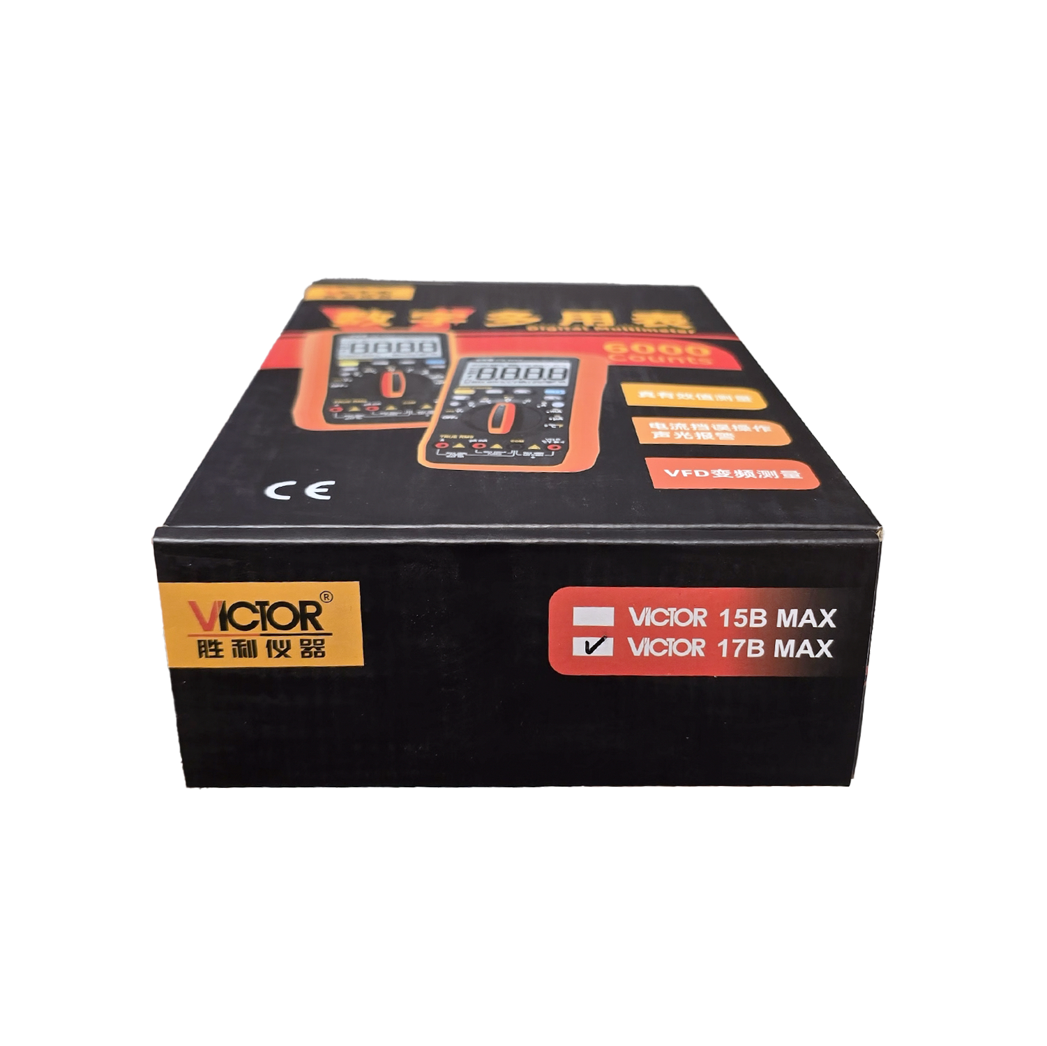 English: Victor 17B MAX True-RMS Digital Multimeter (5999 counts, DC/AC 1000V, DC/AC current to 10A, resistance to 60MΩ, capacitance to 60mF, frequency 10Hz–10MHz, temperature –55°C~1000°C)