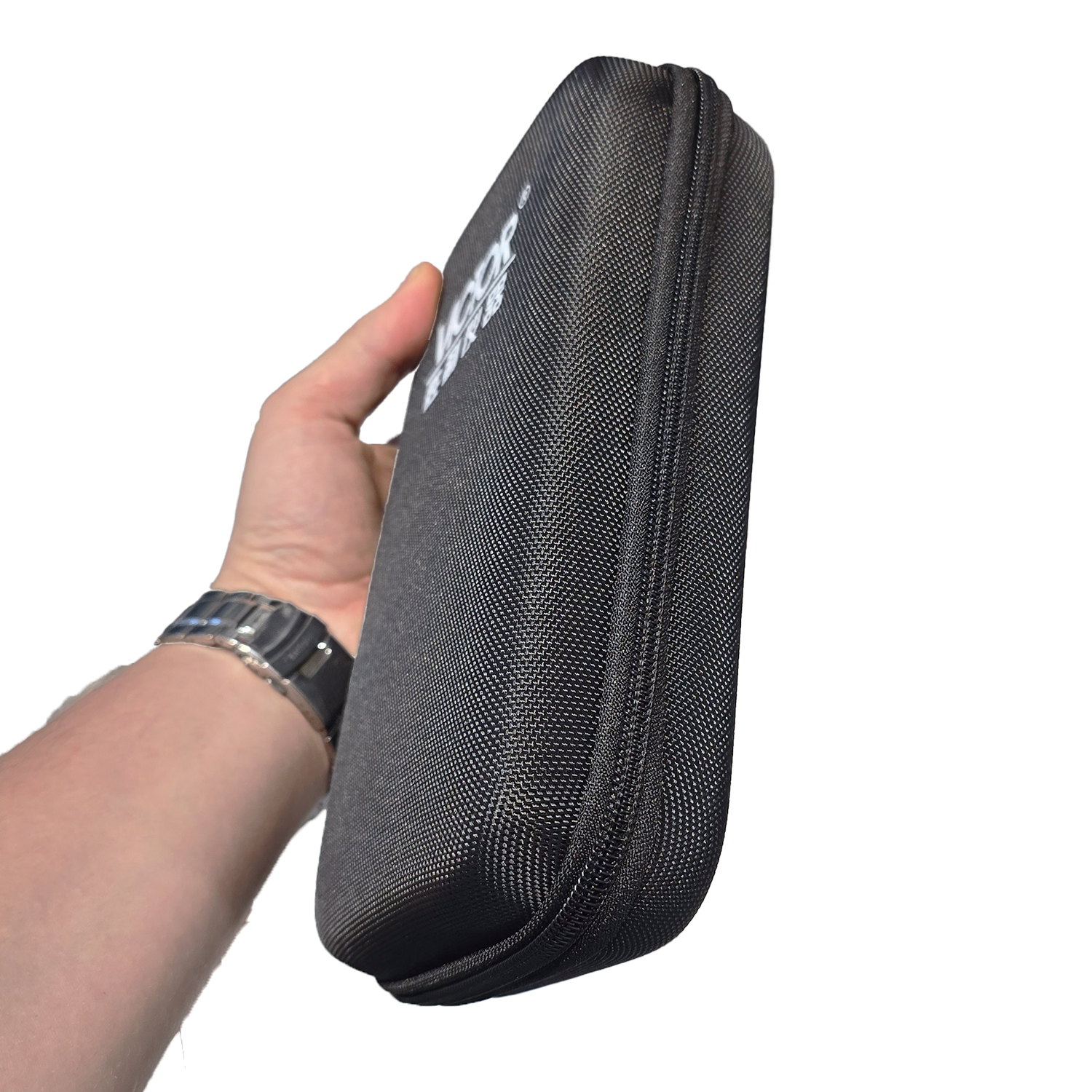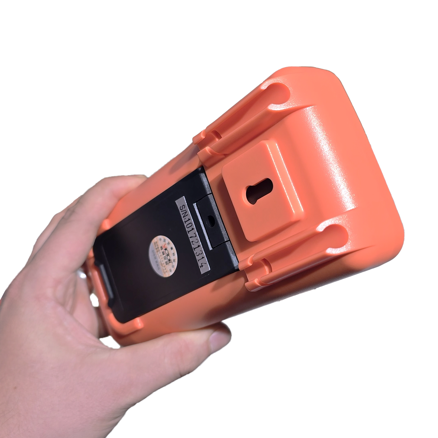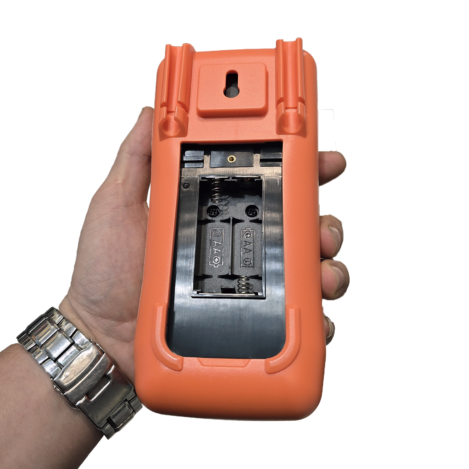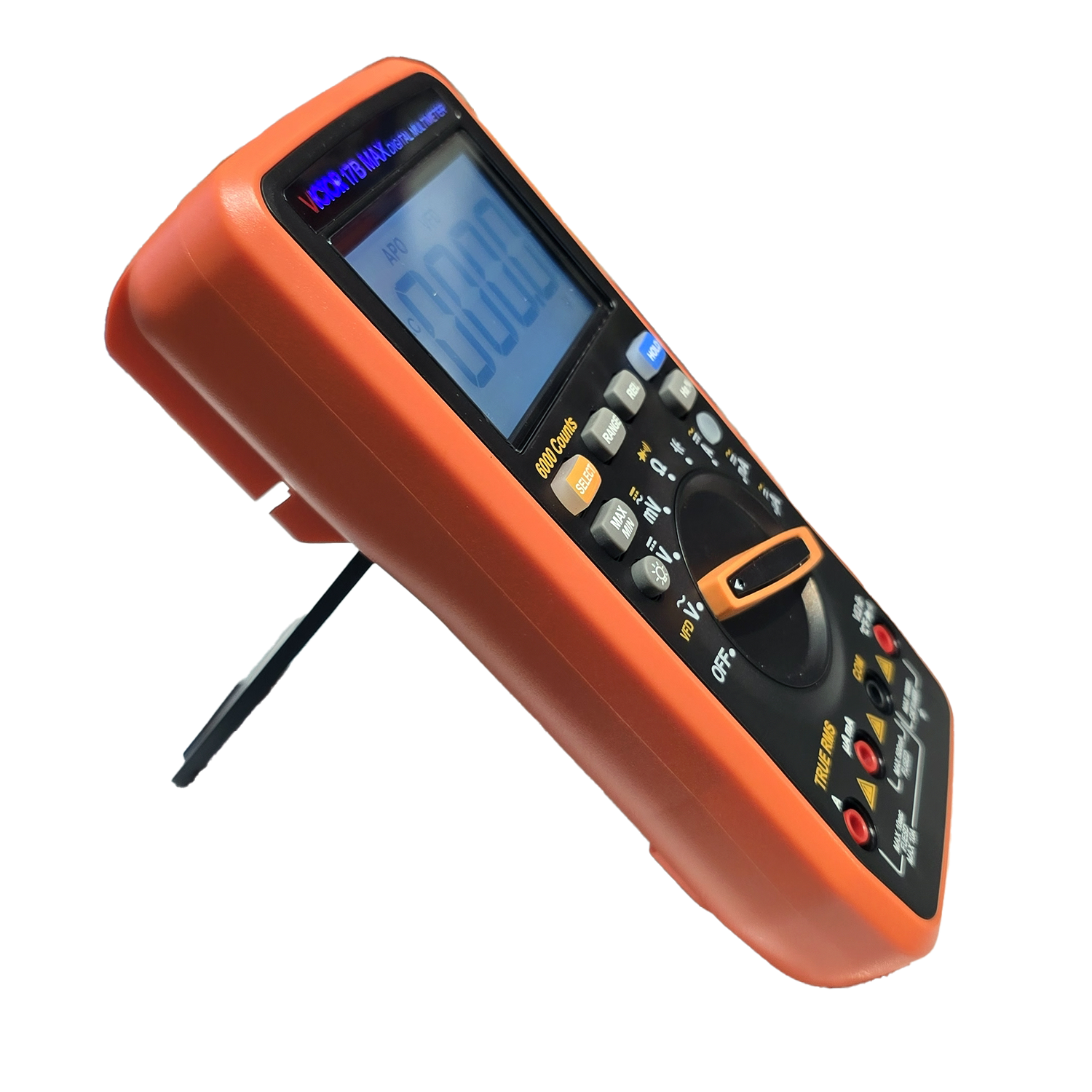 بدنه‌ی دور‌لاستیک نارنجی/مشکی برای ضدلغزش بودن، کلیدهای بزرگ با کنتراست مناسب، پایه‌ی تکیه‌گاه پشتی برای کار روی میز و صفحه‌نمایش LCD با آیکون‌های واضح (HOLD، REL، MAX/MIN، باتری). فرم‌فکتور جمع‌وجور 187×88×45 میلی‌متری، حمل روزانه را ساده می‌کند.