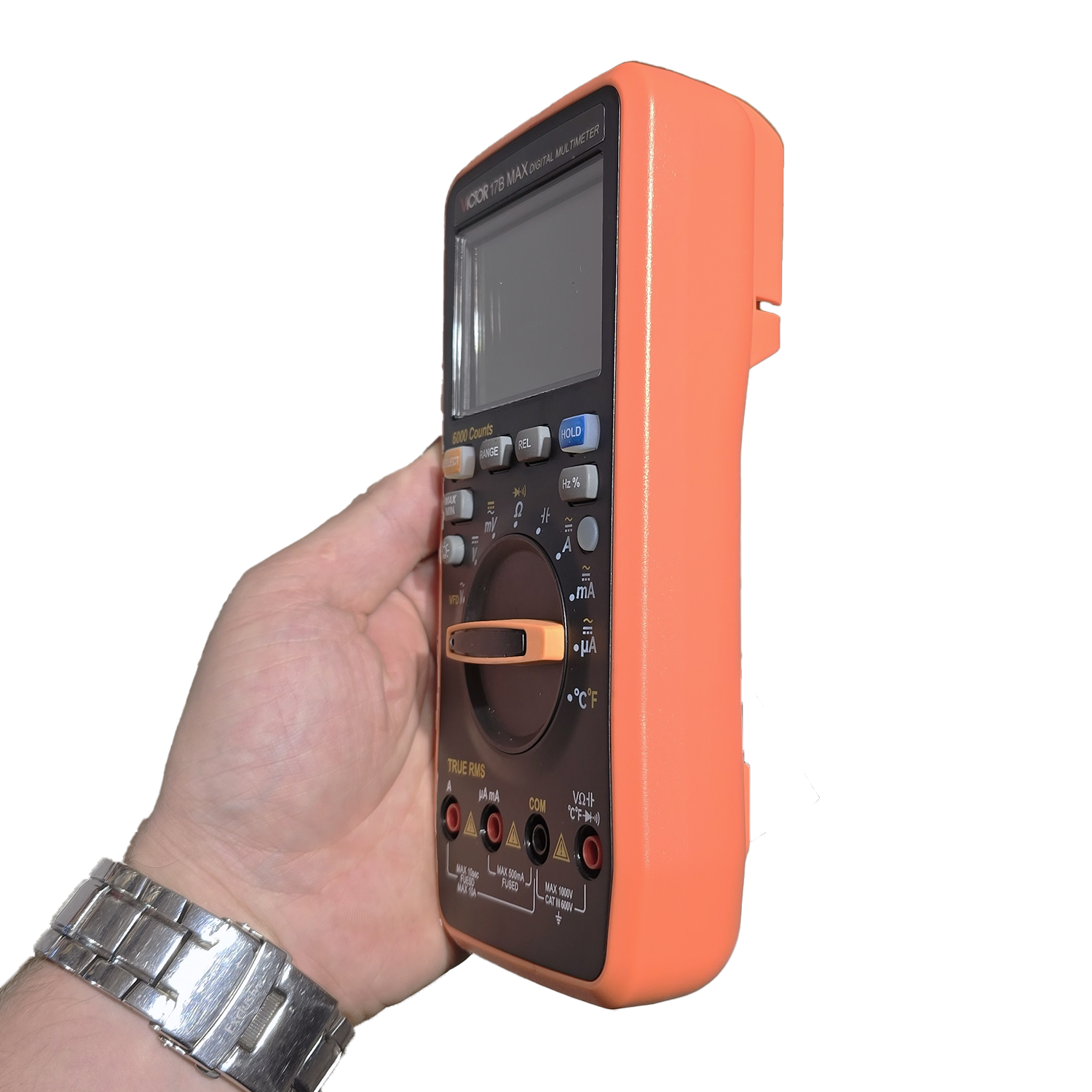 مولتی متر دیجیتال ویکتور مدل VICTOR 17B MAX یک مولتی‌متر حرفه‌ای True-RMS برای برق‌کاران، تکنسین‌های تعمیرات صنعتی/الکترونیک و سرویس تابلو برق است. نمایشگر 5999 کانت (۳⅚ رقم) با پس‌زمینه روشن و نرخ نمونه‌برداری ~۳ بار در ثانیه خوانایی عالی و پاسخ سریع می‌دهد. رنج‌های اندازه‌گیری دستگاه شامل ولتاژ DC/AC تا 1000V، جریان DC/AC تا 10A، مقاومت تا 60MΩ، خازن تا 60mF، فرکانس 10Hz تا 10MHz، Duty 1%–99% و دما –55°C تا 1000°C (با ترموکوپل نوع K) است. برای ایمنی، هشدار نوری و صوتی در اتصال اشتباه رنج جریان دارد و در افت ولتاژ باتری، آیکون مخصوص روی LCD ظاهر می‌شود.