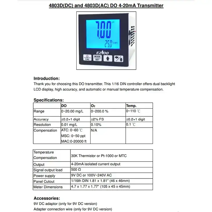 ترانسمیتر و نمایشگر تابلویی اکسیژن محلول EZDO 4803D یکی از محصولات پیشرفته و باکیفیت کمپانی EZDO تایوان است که برای نمایش و کنترل مداوم سطح اکسیژن محلول در آب طراحی شده است. این دستگاه با بهرهگیری از فناوریهای روز دنیا، مقادیر اندازهگیری شده را با دقت بالا از طریق خروجی سیگنال جریان 4-20 میلیآمپر به سیستمهای کنترلی منتقل میکند و با سیستمهای PLC/SCADA یا سایر ماژولهای ورودی سازگار است.
