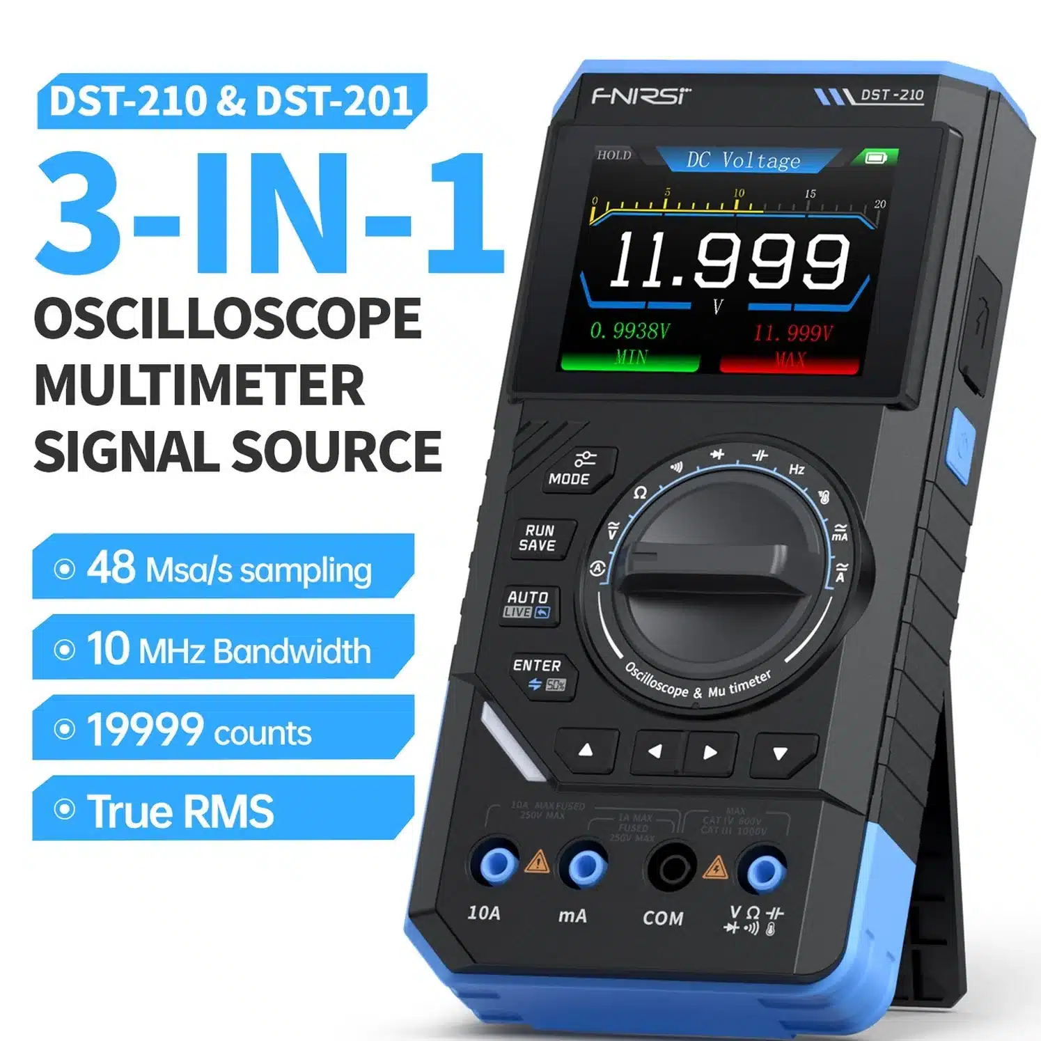 مولتی‌متر دستی ۳ در ۱ فینرسی مدل FNIRSI DST-210 با قابلیت اسیلوسکوپ و سیگنال ژنراتور یک دستگاه چندکاره حرفه‌ای است که سه ابزار اصلی مهندسی یعنی مولتی‌متر دیجیتال TRMS با 19999 کانت، اسیلوسکوپ دستی با پهنای باند 10 مگاهرتز و نرخ نمونه‌برداری 48MSa/s، و سیگنال ژنراتور با 13 نوع موج خروجی را در یک بدنه مقاوم و قابل‌حمل ترکیب کرده است.