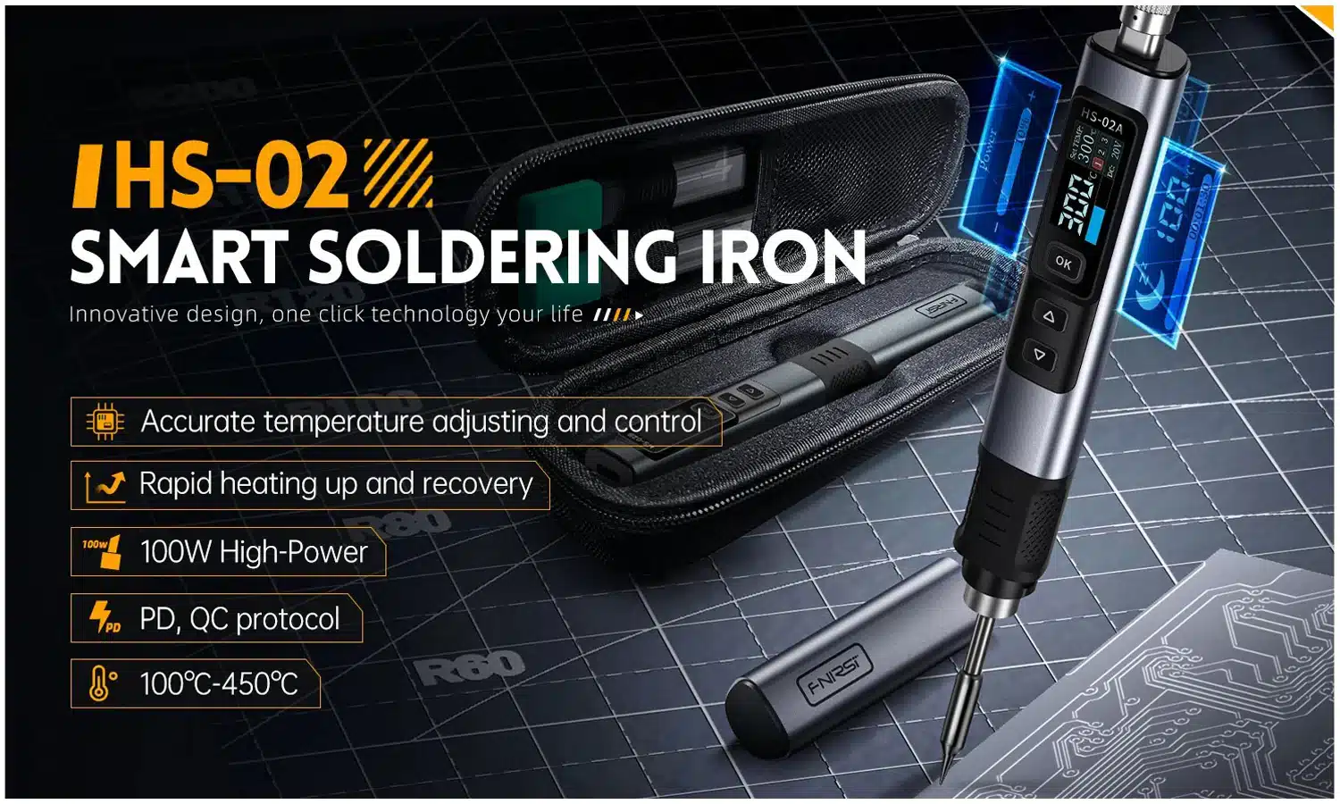 هویه هوشمند فینرسی مدل FNIRSI HS-02 یک هویه قلمی دیجیتال، پرقدرت و قابل‌حمل برای تعمیرات موبایل و بردهای الکترونیکی است که با راه‌اندازی سریع، کنترل PID و امکانات هوشمند، فرایند لحیم‌کاری را دقیق‌تر و ایمن‌تر می‌کند. English name & key specs: FNIRSI® HS‑02 Intelligent Soldering Iron — 100W max, 100–450 °C, 0.96″ color display, CNC metal shell, PD/QC (9–20 V) & DC 9–20 V input, adaptive power, presets (CH1–CH3), sleep/auto‑standby, temperature accuracy <2%.