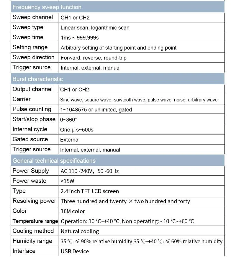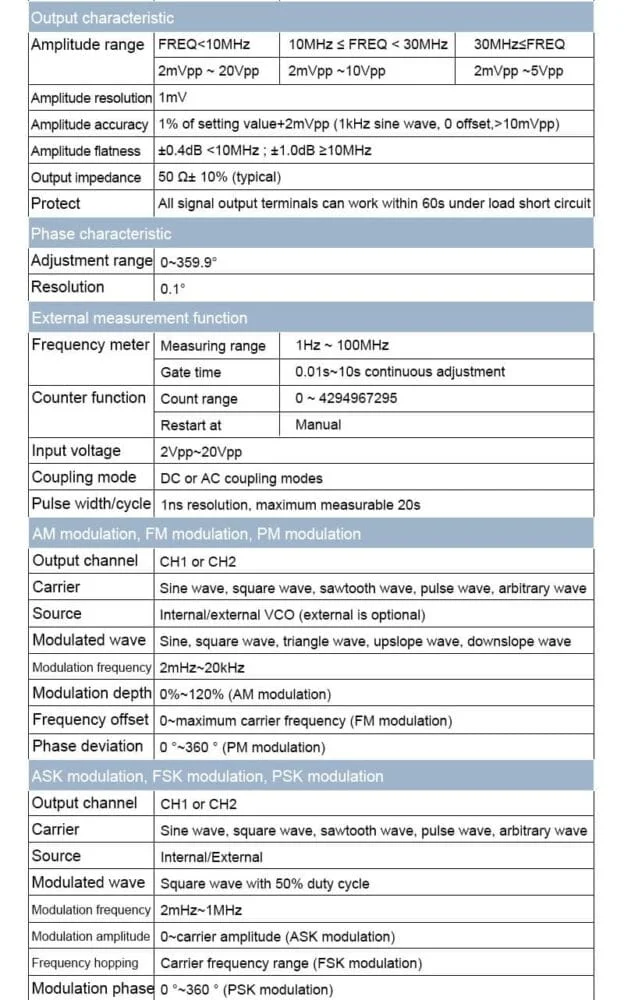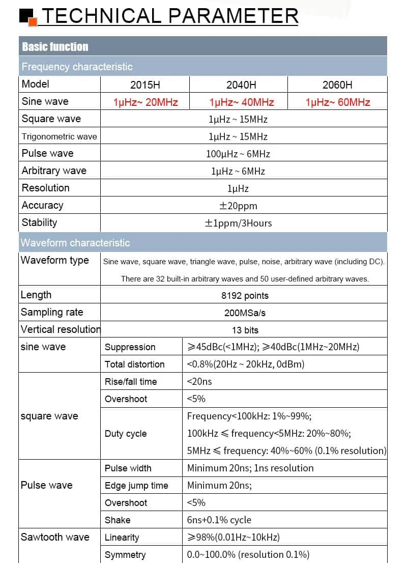 سوئیپ فانکشن ژنراتور قابل برنامه ریزي فرکانس از 1 میکرو هرتز تا 15 مگاهرتز دیجیتال دو کانال خروجی انواع شکل موج خروجی تولید شکل موج دلخواه سرعت 266MS/s رزولوشن 14Bit دارای نمایشگر رنگی TFT LCD قابل اتصال به PC با پورت USB با کابل ارتباطی و نرم افزار