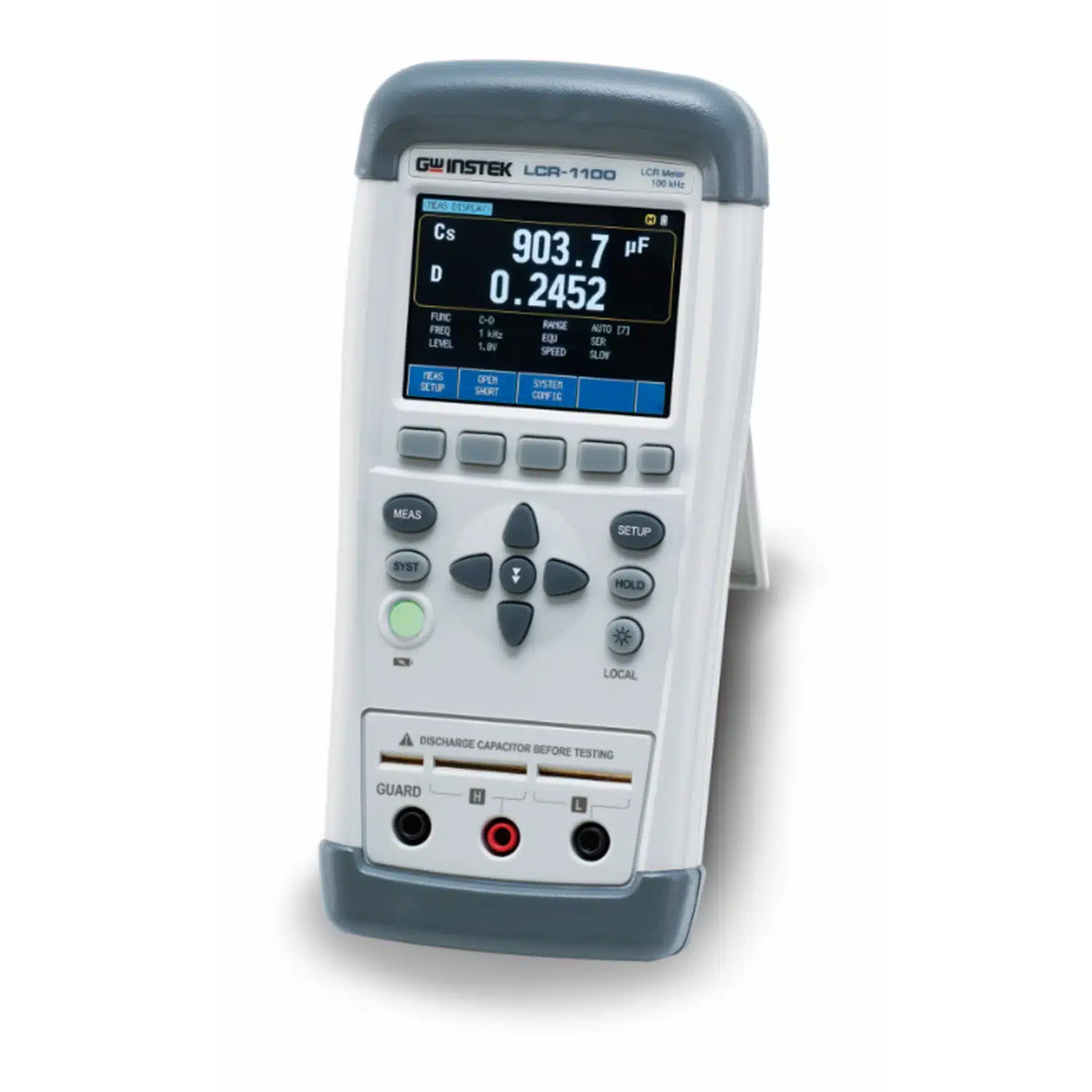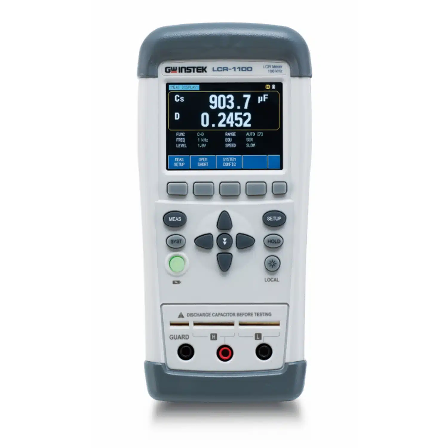 ال سی آر متر گودویل مدل GW Instek LCR-1100 یک LCR متر دستی حرفه‌ای با دقت پایه ۰.۲٪، نمایشگر رنگی ۲.۸ اینچ لمسی و ۵۰,۰۰۰ کانت برای سطر اصلی و فرعی است. این مدل با فرکانس تست تا ۱۰۰ کیلوهرتز، سطح تست AC (0.3/0.7/1Vrms) + DC (±1V)، ۱۵ ترکیب اندازه‌گیری و حالت Auto‑LCZ، سنجش دقیق L, C, R, Z, ESR, Q, D, θ را در مدار معادل سری/موازی انجام می‌دهد. English: GW Instek LCR‑1100 Handheld LCR Meter — 0.2% basic accuracy, 2.8″ TFT touch LCD, 50,000 counts, test frequencies up to 100 kHz, AC 0.3/0.7/1 Vrms + DC ±1 V, Auto‑LCZ, USB HID/VCOM.