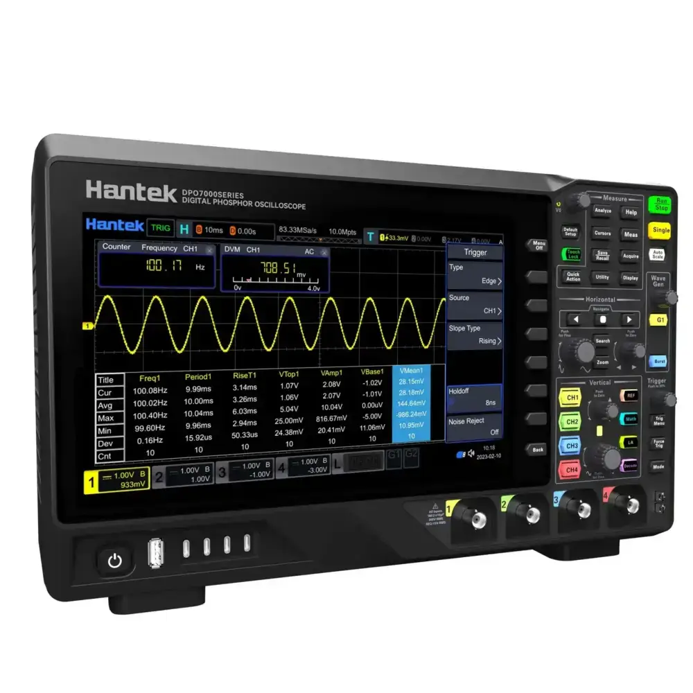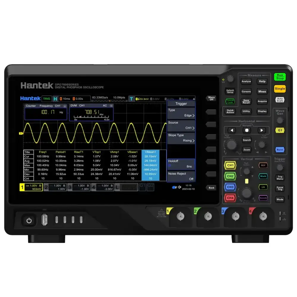 HANTEK DPO-7104C با داشتن یک نمایشگر لمسی رنگی 10.1 اینچی، تجربه کاربری ساده و جذابی را ارائه می‌دهد. این نمایشگر با قابلیت چند لمسی خود، کار با دستگاه را بسیار راحت کرده و دسترسی به ابزارها و منوها را سریع‌تر می‌کند.