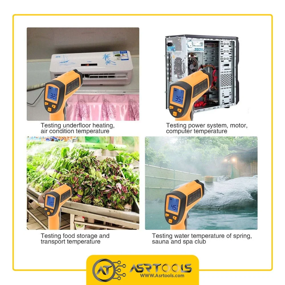 دماسنج اینفرارد اندازه گیری دما به سانتی گراد و فارنهایت قابلیت روشن و خاموش کردن نشانگر لیزر دستگاه نور صفحه نمایش خاموشی اتوماتیک