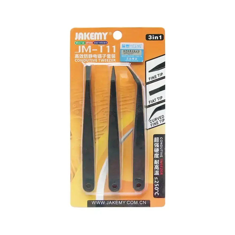 انبر پنس جک می مدل JAKEMY JM-T11 مجموعه سه عددی یکی از پرکاربردترین ابزارهای تعمیراتی برای تکنسین‌های الکترونیک، موبایل و کامپیوتر است. این ست حرفه‌ای شامل سه نوع پنس با طراحی متفاوت و بدنه ضد الکتریسیته ساکن می‌باشد و با بهره‌گیری از مواد باکیفیت، دقت، ایمنی و دوام بالا را در اختیار کاربر قرار می‌دهد.