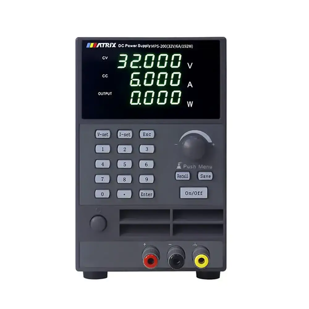English name: Matrix MPS‑200 Programmable Single‑Channel DC Power Supply, 0–32 V / 0–6 A (192 W), 1 mV / 0.1 mA resolution, triple V/A/W display, output ON/OFF, memory, PC connectivity via USB / RS‑232 / RS‑485.