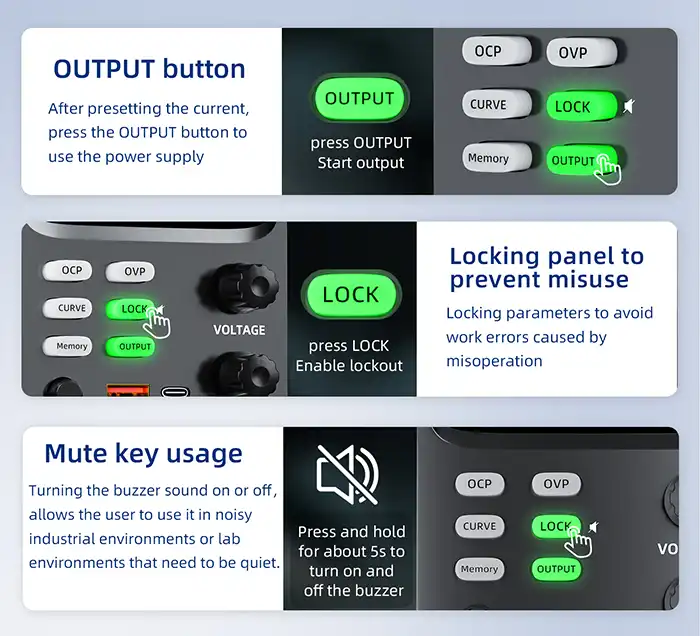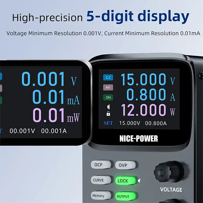 • تنظیمات دقیق: ولتاژ تا ۰.۰۰۱ ولت و جریان تا ۰.۰۱ میلی‌آمپر