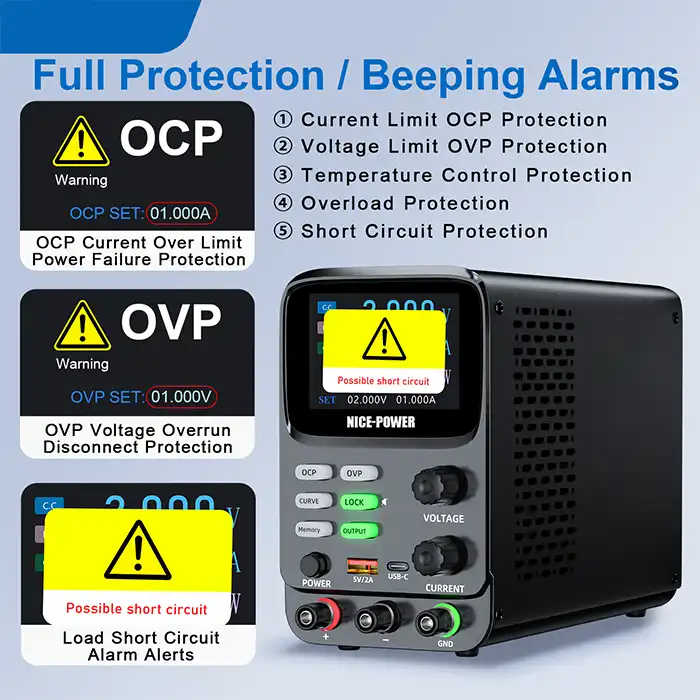 NICE POWER SPPS-K305 مجهز به نمایشگر دیجیتال پنج رقمی، چهار حافظه برای ذخیره تنظیمات پرکاربرد، حالت شبیه‌سازی باتری، و انواع سیستم‌های حفاظتی از جمله حفاظت در برابر اتصال کوتاه (Short Circuit)، افزایش دما (Over Temp)، اضافه بار (Overload)، و جریان و ولتاژ بیش از حد (OCP/OVP) است.