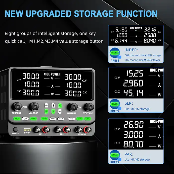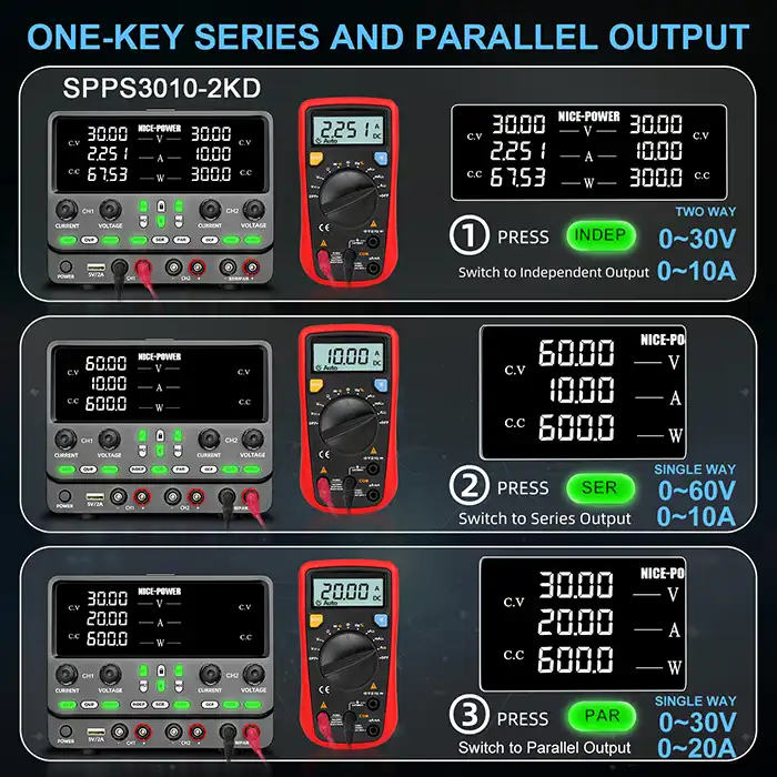 منبع تغذیه نایس پاور مدل SPPS3010-2KD نسبت به مدل‌های تک کاناله (مانند SPPS3010-K305) قابلیت استفاده همزمان از دو خروجی مستقل، حالت سری و موازی را تنها با یک کلید و بدون نیاز به سیم‌کشی پیچیده ارائه می‌دهد.