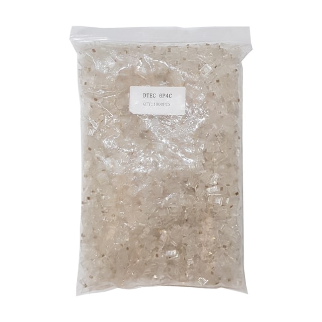 English name: RJ11 Modular Plug 6P4C, transparent polycarbonate body, gold‑plated brass contacts, non‑shielded, crimp type for 2‑line telephone/voice/ADSL cables.
