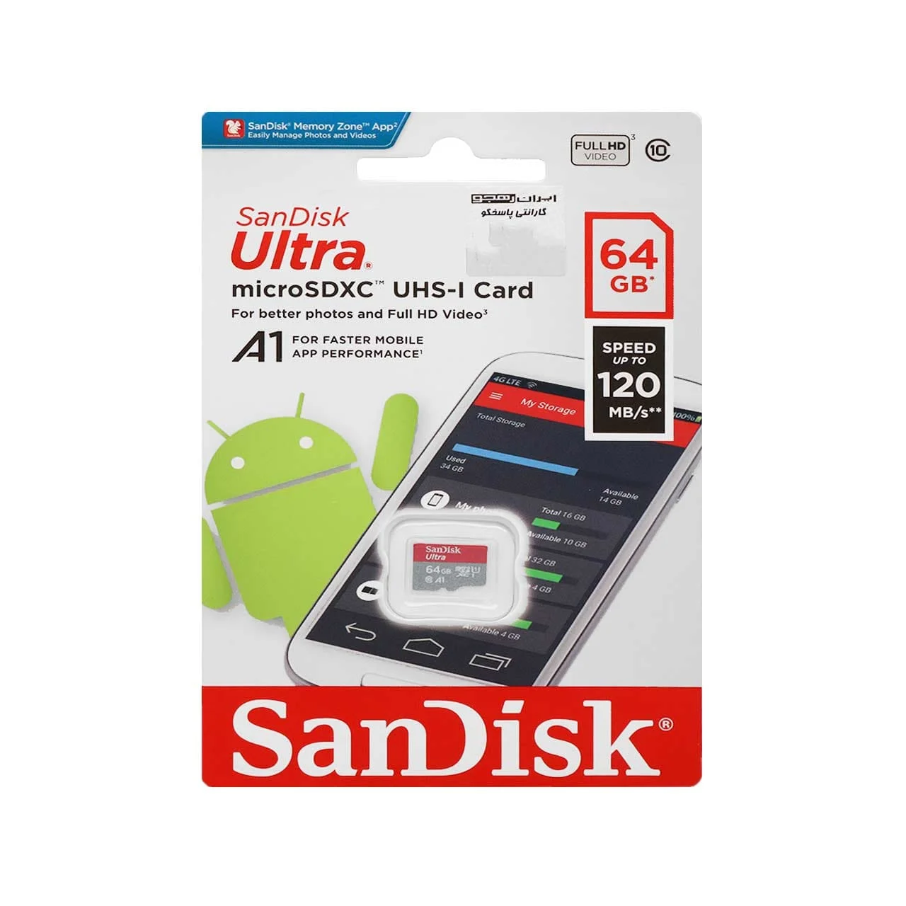 کارت حافظه microSDXC سن دیسک مدل Ultra A1 کلاس 10 استاندارد UHS-I سرعت 120MBps ظرفیت 64 گیگابایت
