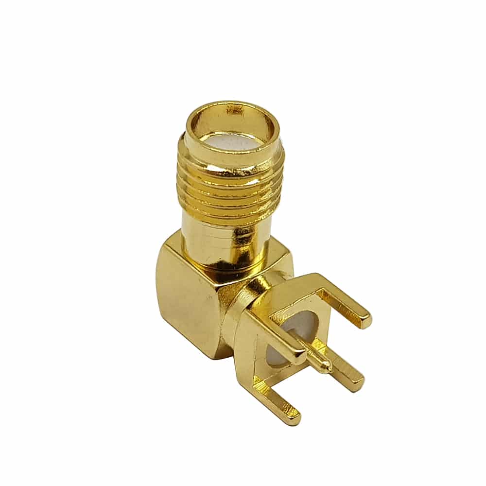 بدنه‌ی طلایی‌رنگ این کانکتور جلوه‌ای حرفه‌ای به برد می‌دهد. زانو ۹۰ درجه باعث می‌شود خروجی در امتداد لبه‌ی PCB قرار گیرد تا به‌راحتی از کنار باکس خارج شود. دو شاخه‌ی زمین مثل گیره، پس از لحیم‌کاری کانکتور را محکم نگه می‌دارند و پین مرکزی کوتاه و مستقیم، مسیر RF را کوتاه و کم‌تلف می‌کند. عایق سفید PTFE در دهانه‌ی کانکتور دیده می‌شود که ثبات الکتریکی را تضمین می‌کند.