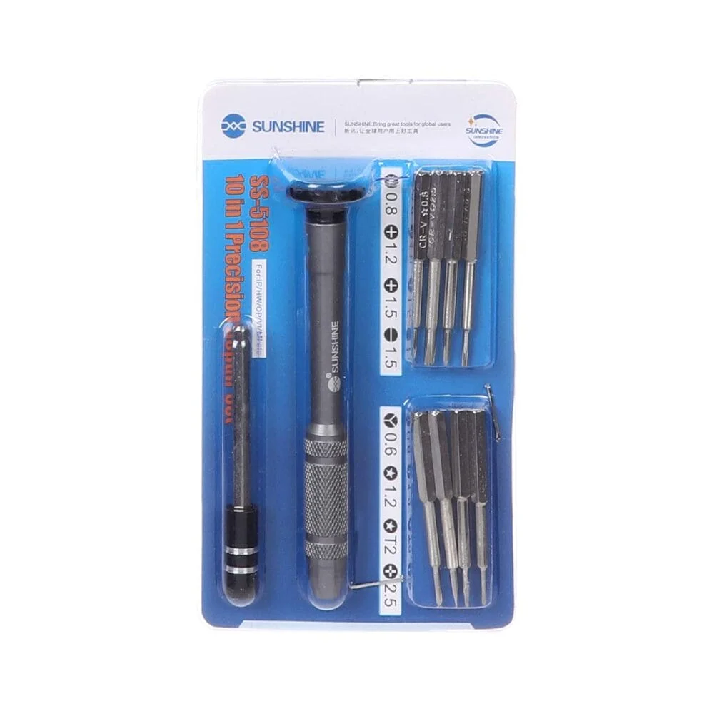 (English: Sunshine SS-5108 10-in-1 Precision Screwdriver Set with aluminum-alloy handle, S2-steel bits, magnetic extension rod, non-slip knurled grip, and swivel cap)