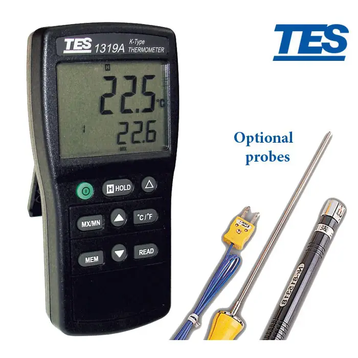 ترمومتر تیپ K تی ای اس مدل TES-1319A یک دماسنج تماسی تک‌کاناله با ورودی ترموکوپل K است که بازه‌ی ℃50- تا +1300 را با تفکیک‌پذیری ۰.۱ درجه و سرعت نمونه‌برداری ۲.۵ ثانیه اندازه‌گیری می‌کند. قابلیت‌های MAX/MIN/AVG، Data Hold، حافظه داخلی (۱۵۰ رکورد)، Auto Power Off و تعویض واحد سانتی‌گراد/فارنهایت آن را برای خطوط تولید، کوره‌ها، تست قطعات صنعتی، HVAC و آزمایشگاه‌ها به انتخابی دقیق و قابل اتکا تبدیل می‌کند.