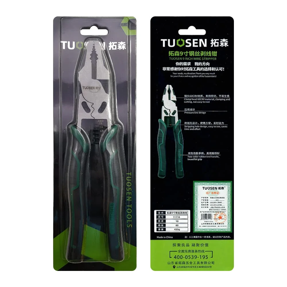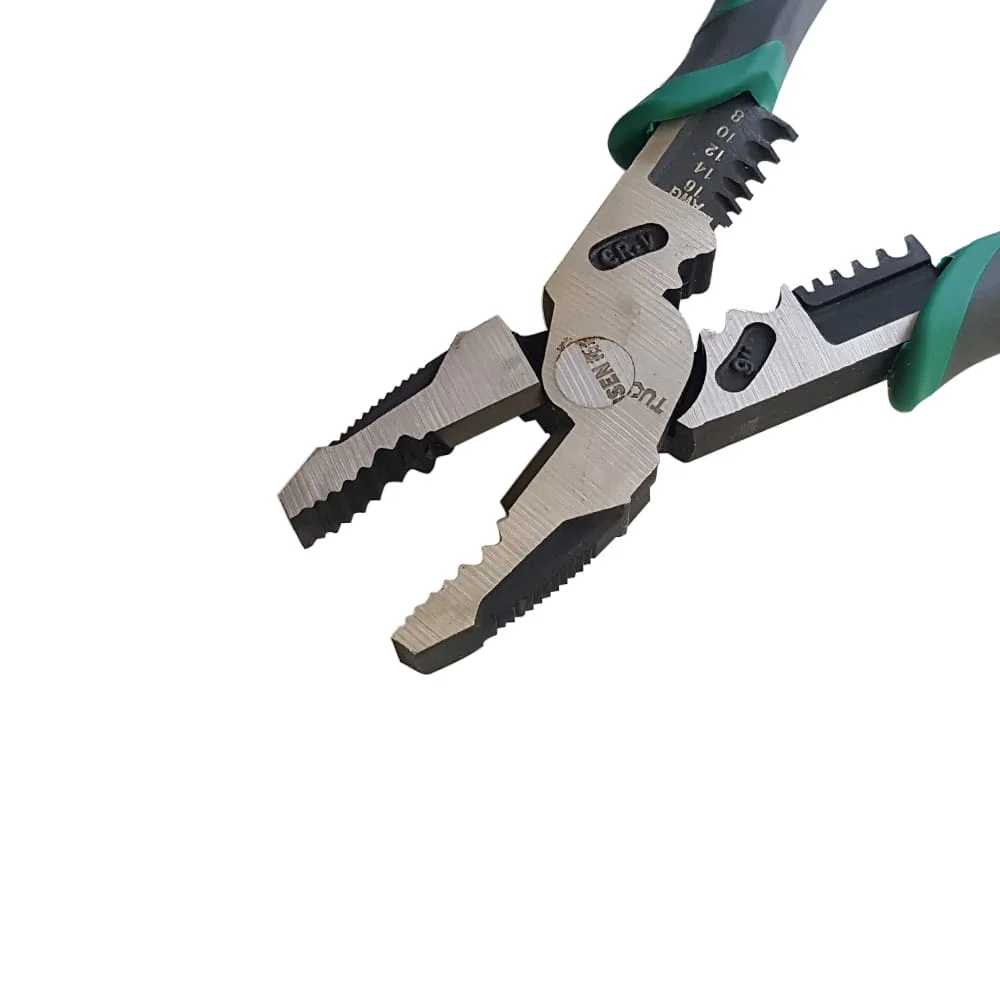 معادل انگلیسی: TUOSEN Multi-Purpose Combination Pliers Model 11116, 9-inch size, forged steel body, ergonomic anti-slip grip, cutting, gripping, bending, stripping capabilities.