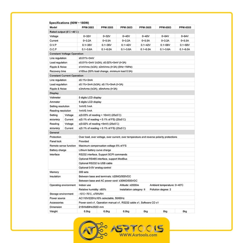• PPM‑6003 (۰–۶۴ V، ۳.۲ A): برای آزمون تجهیزات با ولتاژ بالا اما جریان متوسط مناسب است؛ اگر تمرکز شما جریان تا ۵.۵ A است، PPM‑3005 انتخاب بهینه‌تری خواهد بود.
