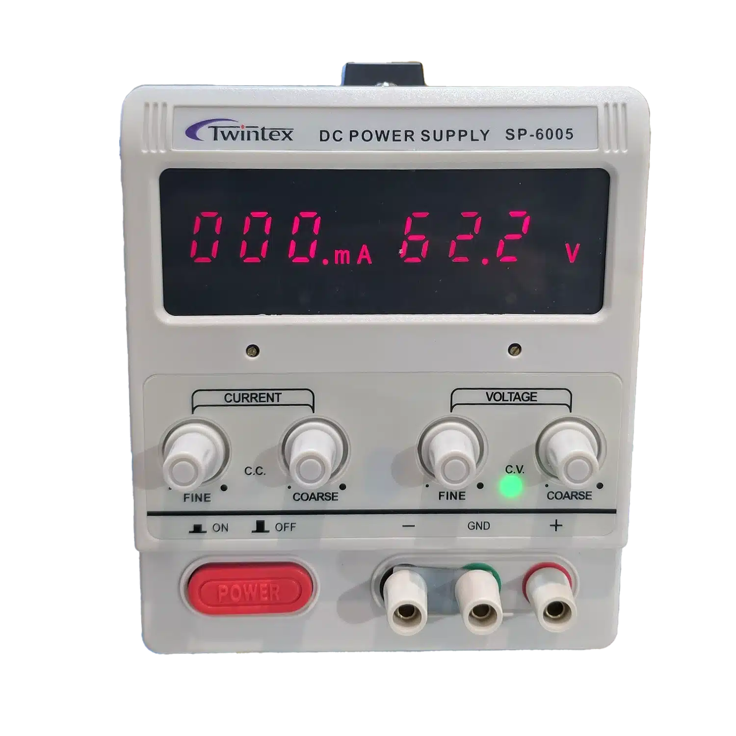 English name: Twintex SP‑6005 Switch‑Mode DC Power Supply — 0–60 V, 0–5 A, single output, dual LED display, CV/CC modes, fine & coarse knobs, OVP/OCP/OTP protections, cooling fan, 3 binding posts.