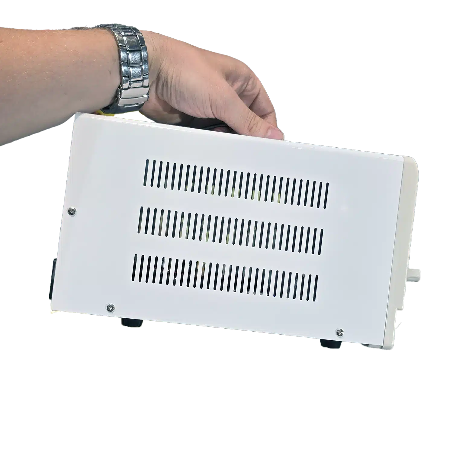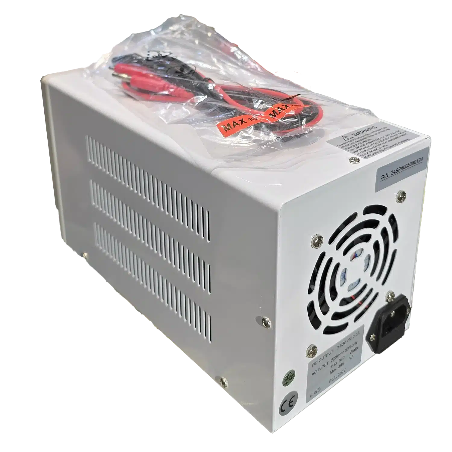 بدنه رومیزی مقاوم با پنل سفید/نقره‌ای، کلید POWER بزرگ قرمز و سه ترمینال خروجی جلو (مثبت/منفی/زمین) استفاده روزانه را ساده می‌کند. چیدمان ولوم‌ها و چراغ‌های C.V/C.C استاندارد و آشناست؛ بنابراین حتی کاربران تازه‌کار هم خیلی سریع با آن ارتباط می‌گیرند. ابعاد جمع‌وجور و وزن مناسب، جابه‌جایی بین میزهای کارگاه یا آزمایشگاه را آسان می‌سازد.