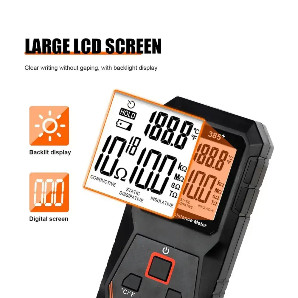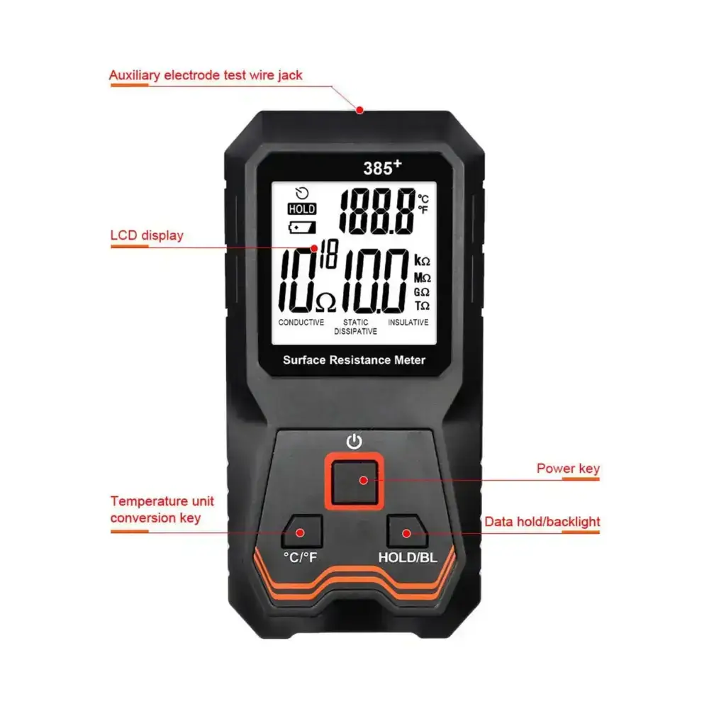 دستگاه VC385+ Surface Resistance Tester یک ابزار دستی برای اندازه‌گیری مقاومت سطحی مواد است که در کاربردهای مختلف از جمله تست عایق‌ها و ارزیابی ویژگی‌های ضد الکتریسیته ساکن (ESD) استفاده می‌شود. ویژگی‌های این دستگاه عبارت‌اند از: