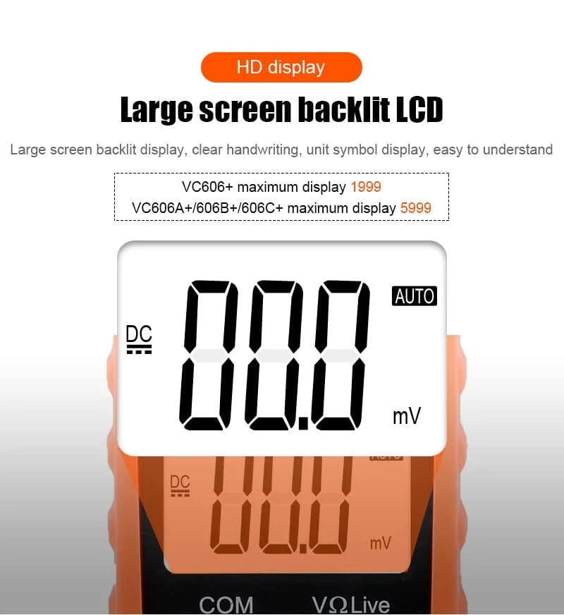 مولتی متر کلمپی ویکتور مدل VICTOR 606C Plus هم دارای کیفیت ساخت بالا به پشتوانه سال ها تجربه توبید مولتی متر و هم دارای ظاهری زیبا می باشد. کیفیت سلکتور و حس کار با آن بسیار ایده آل می باشد. ترکیب رنگ نارنجی و نوک مدادی که از رنگ های اصلی برند ویکتور می باشند در این مولتی متر نیز به کار رفته است.