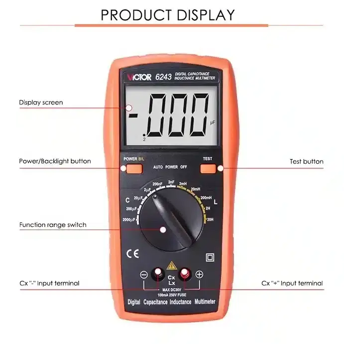 English: VICTOR 6243 Digital Capacitance & Inductance Meter — 2 nF…1000 µF & 2 mH…20 H ranges, 1 pF/1 µH resolution, 3 readings/s, 1999‑count LCD, backlight, auto power‑off, 9V battery.
