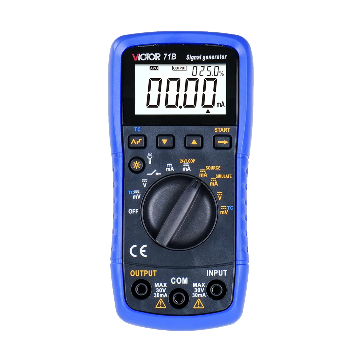 English name & one‑line specs: VICTOR 71B Handheld Signal Generator / Loop Calibrator — DC Voltage Source 0–110 mV & 0–10 V, DC Current Source/Sink 0–22 mA (0.01 mA res.), Measure V 0–30 V & I 0–22 mA, 8‑type Thermocouple Simulation (R/S/B/K/E/J/T/N), ±0.2%+4dgt accuracy, 3×AAA, 147×75×42 mm, ≈300 g.