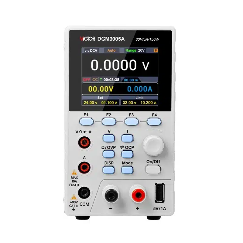 English name: Victor DGM‑3005A Single‑Channel DC Source Meter (Power Supply + 4½‑digit DMM), 0–30V / 0–5A, 150W constant‑power, 10mV/1mA resolution, 2.8″ TFT, USB with SCPI, OVP/OCP, Output ON/OFF, List/Curve monitor.