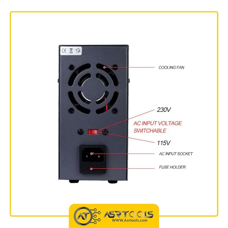 منبع تغذیه متغیر دیجیتال سوئیچینگ ولتاژ 0 تا 30 ولت جریان 0 تا 5 آمپر دارای فن خنک کننده