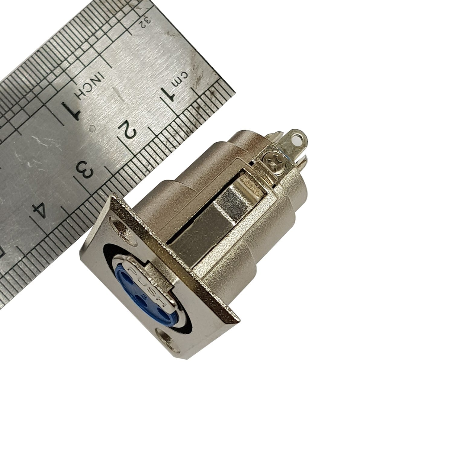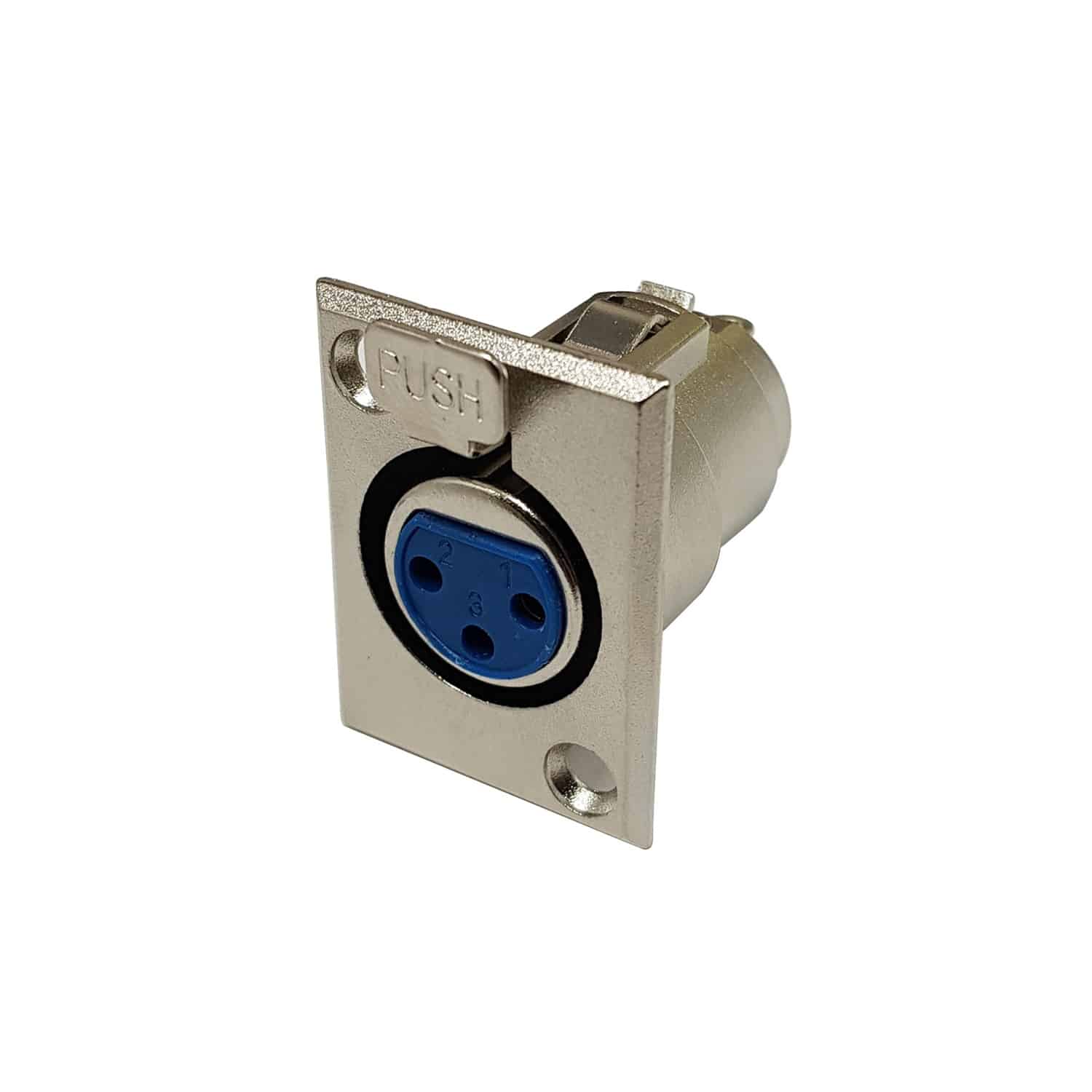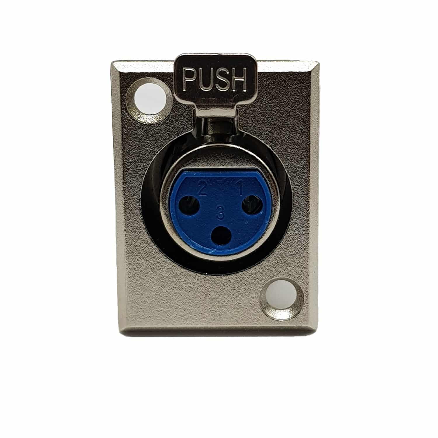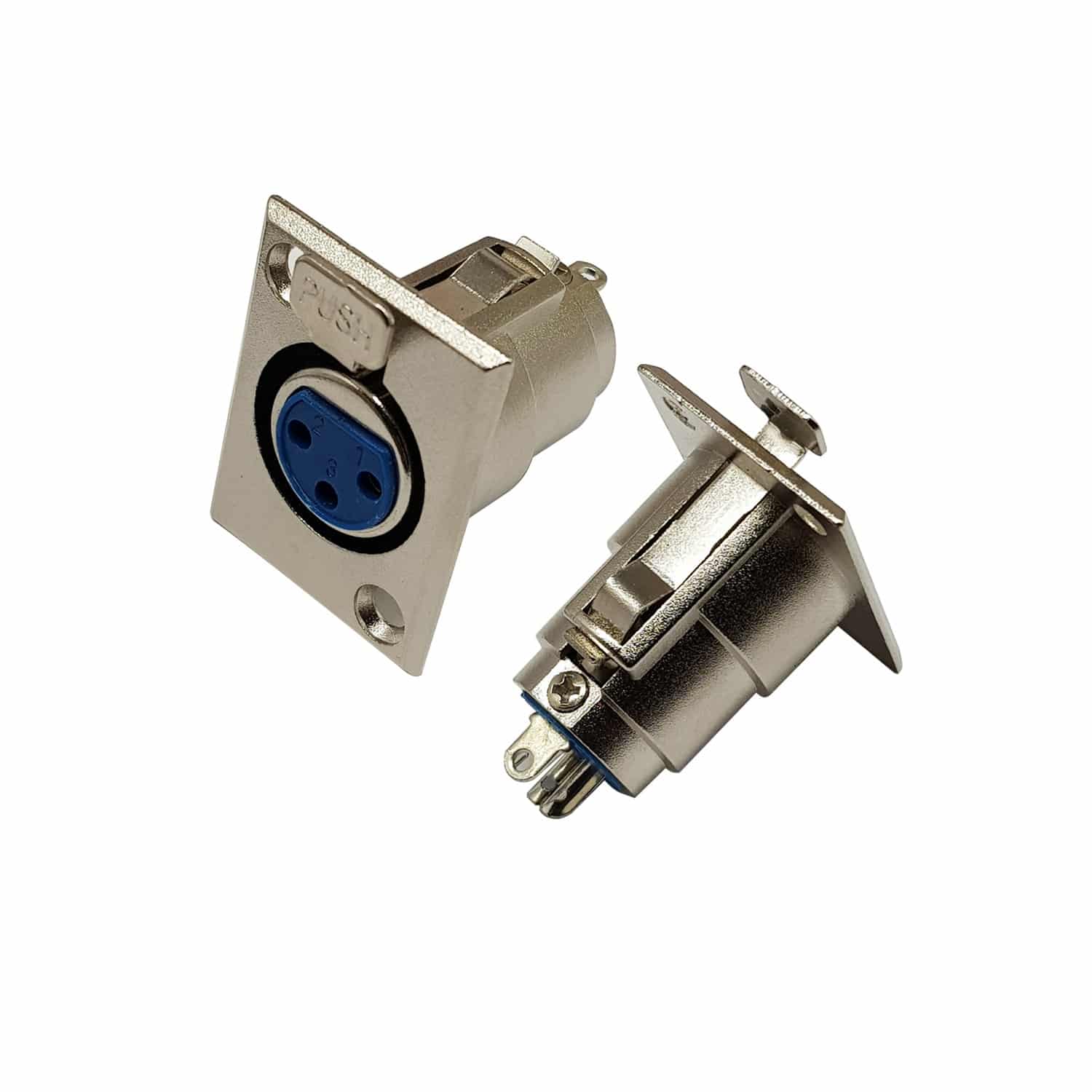 طراحی فلنج مستطیلی با دو سوراخ نصب عمودی، باعث می‌شود فیش کنون XLR مادگی روپنلی قفل دار روی اغلب رک‌ها و پنل‌های استاندارد به‌راحتی جای‌گذاری شود. دکمه‌ی PUSH روی بخش جلویی، دسترسی سریع برای باز کردن قفل را فراهم می‌کند و اینزرت آبی سه‌پین با شماره‌گذاری واضح، خطای سیم‌بندی را کاهش می‌دهد. پوشش نیکلِ بدنه ظاهر حرفه‌ای، مقاومت مکانیکی بالا و محافظت نسبی در برابر خط و خش به همراه دارد.